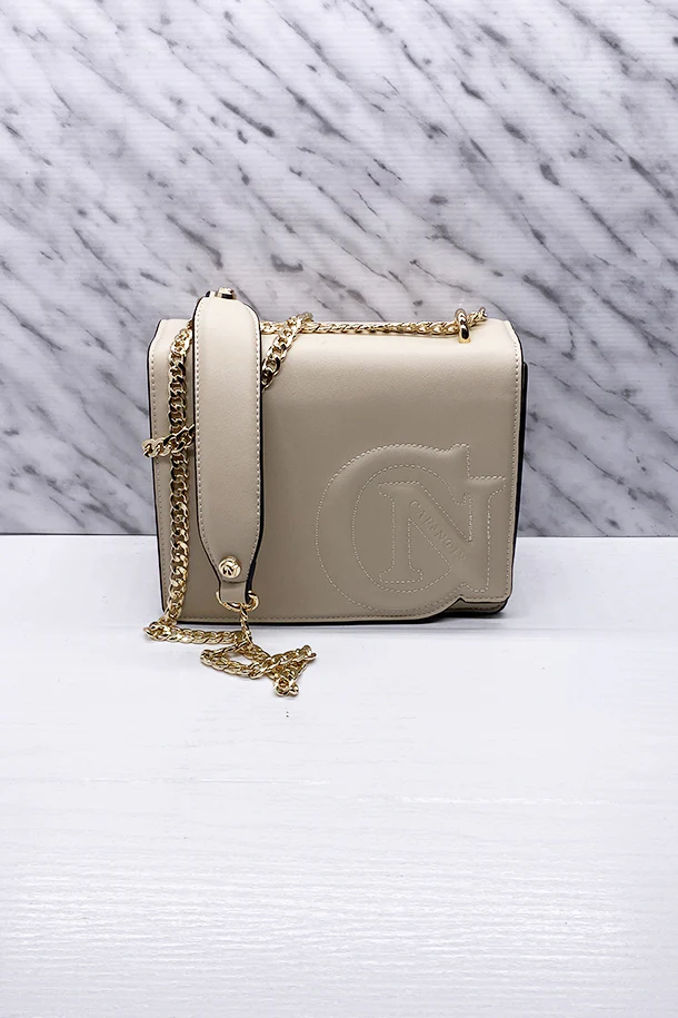 Borsa in eco pelle con tracolla a catena, patta sagomata con logo oversize e clip magnetica, interno foderato con scomparti