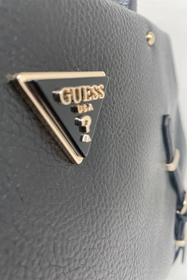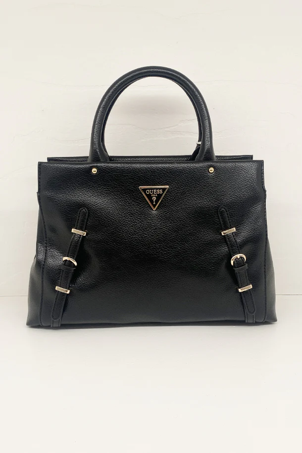 Borsa a mano in eco pelle solid color con doppio manico rigido, lacci con fibbie decorative, badge con logo frontale, tracolla regolabile e removibile, chiusura con zip, interno foderato con scomparti