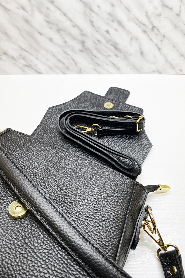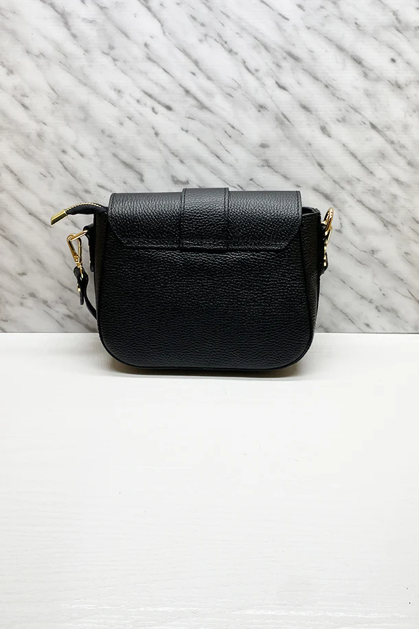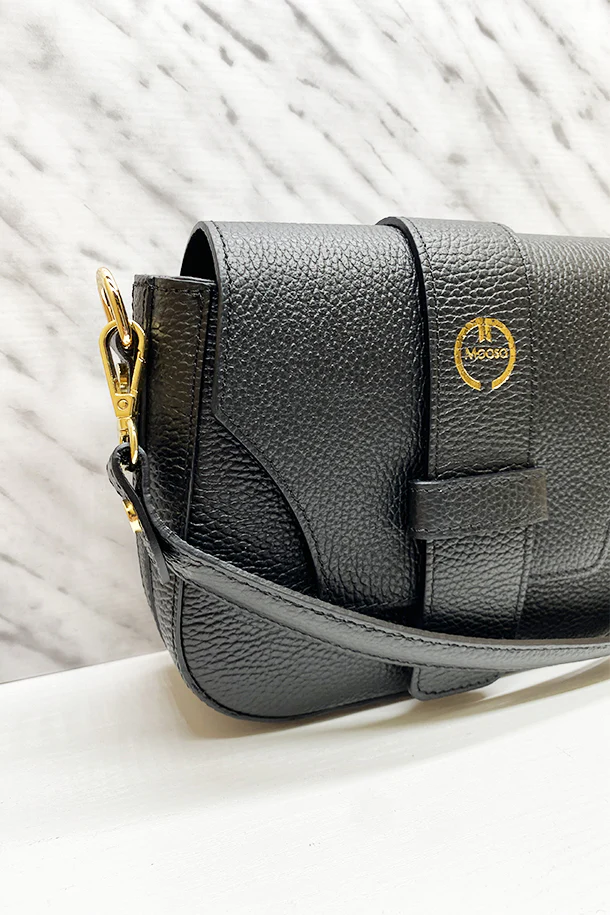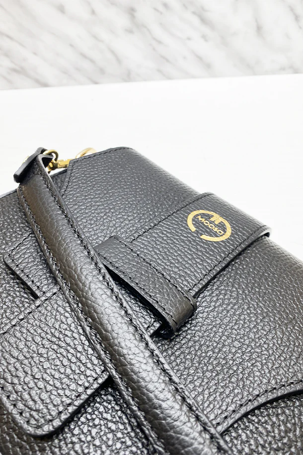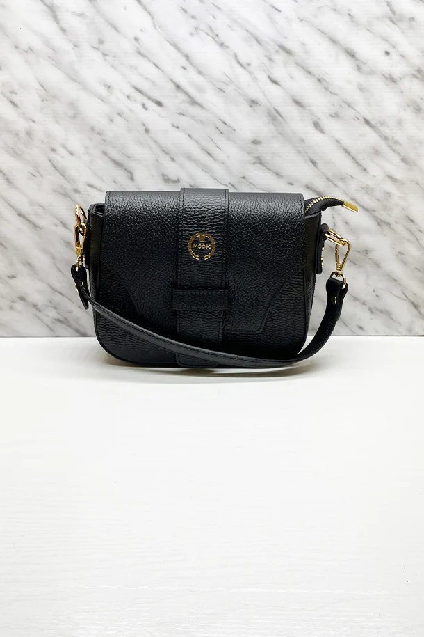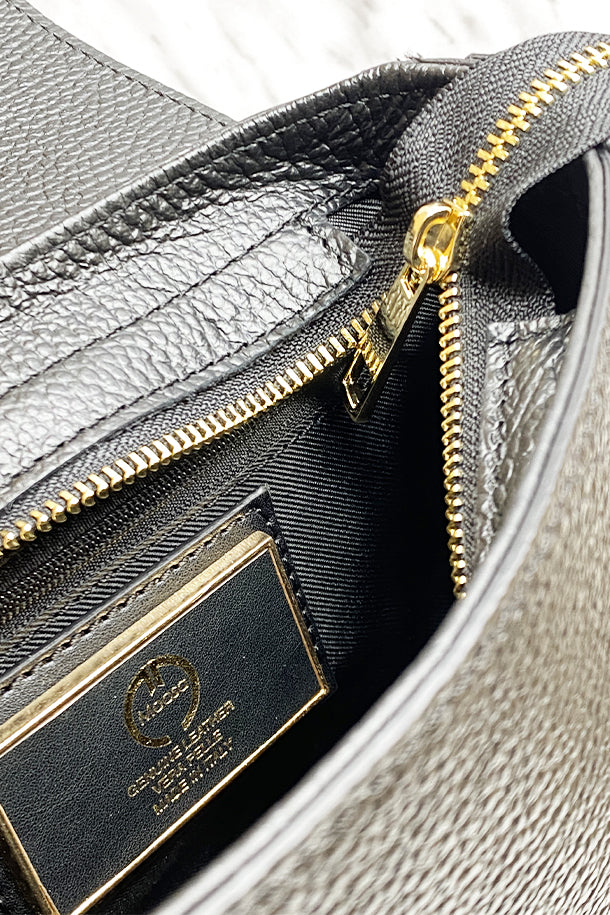 Borsa in pelle martellata con tracolla corta, extra tracolla removibile, laccio di chiusura logato con impressione oro, chiusura con zip, interno foderato con scomparti