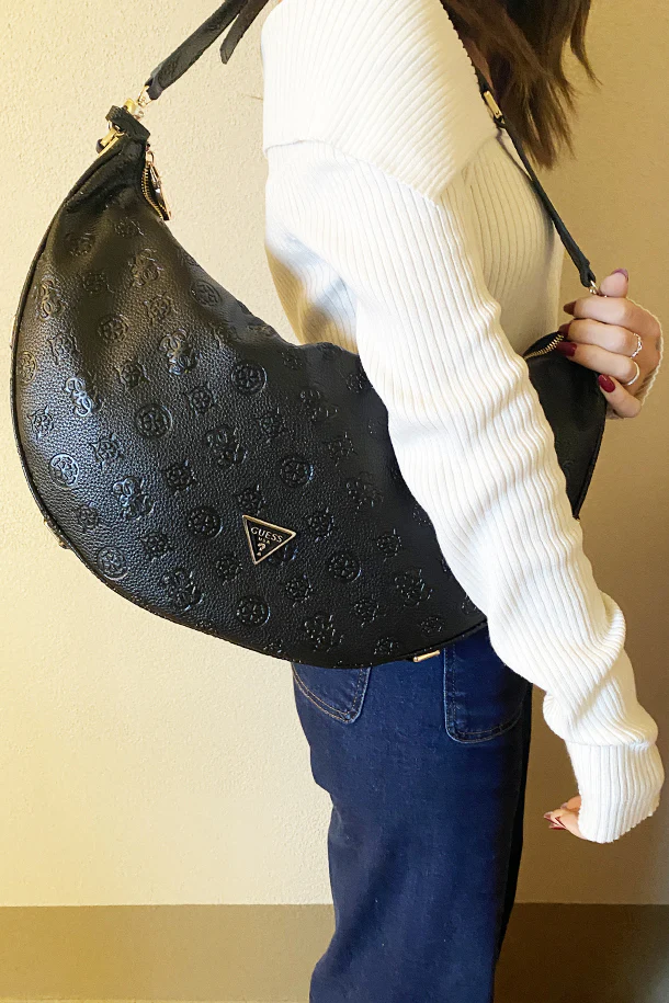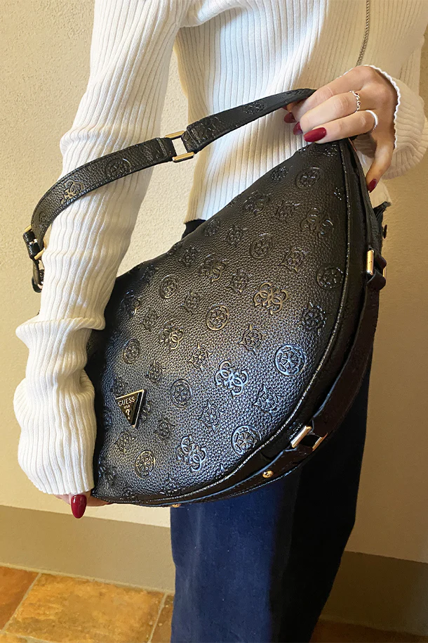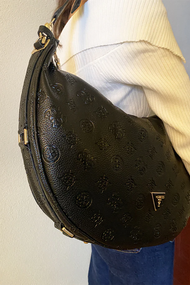 Maxi borsa a tracolla in eco pelle stampigliata all over, logo metallico, chiusura con zip, interno foderato con scomparti
