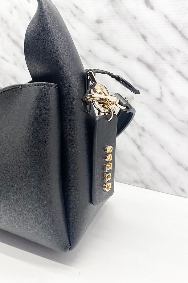 Borsa a mano in eco pelle solid color con manico semi rigido in tinta, tracolla removibile in tinta, logo metallico, charm logato removibile, chiusura con zip, interno foderato con scomparti