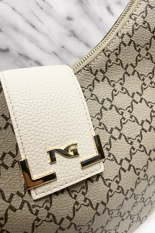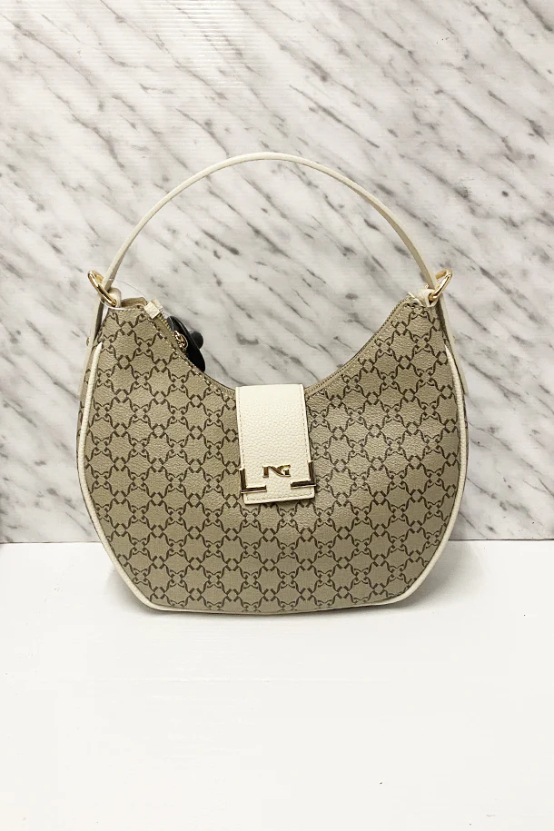 Borsa a spalla in pelle con stampa fantasia logata, dettagli e tracolla corta a contrasto, extra tracolla regolabile e removibile, chiusura con zip e fascia logata, interno foderato con scomparti