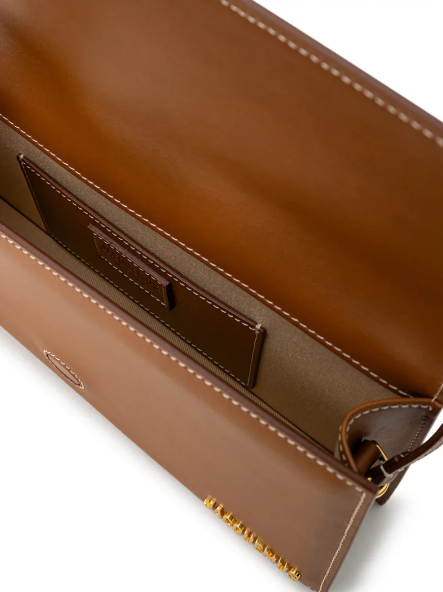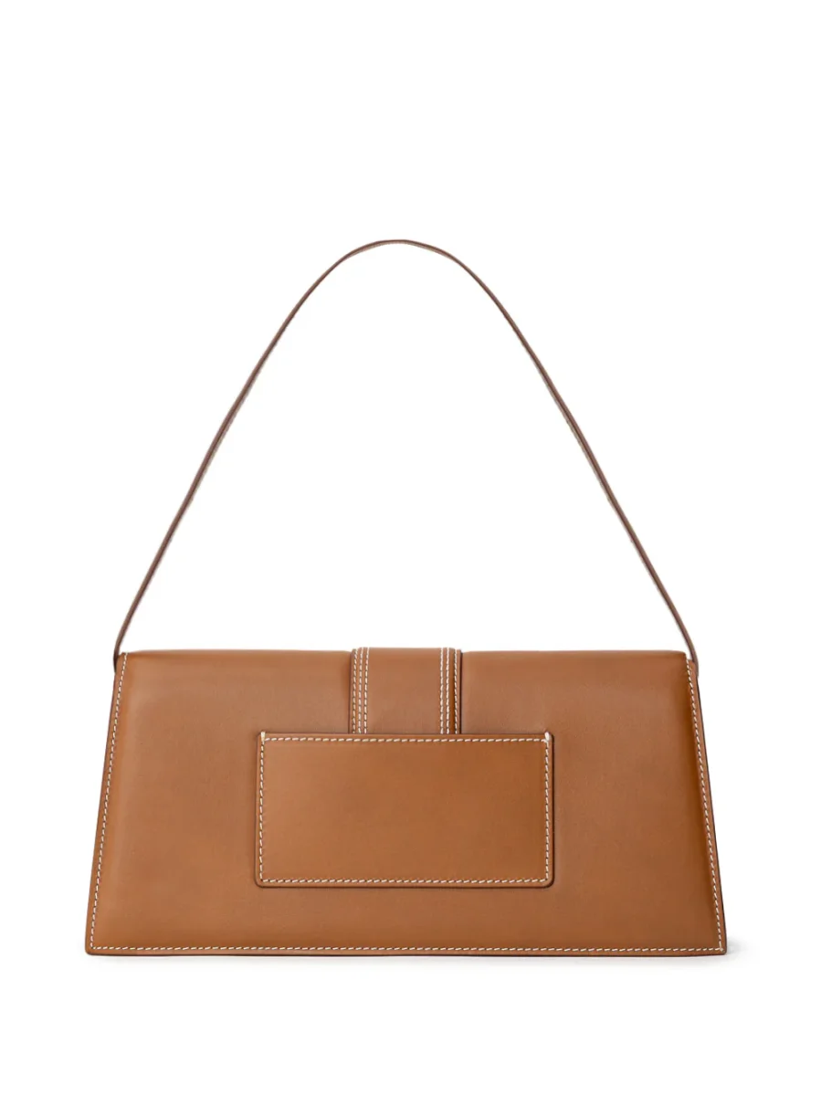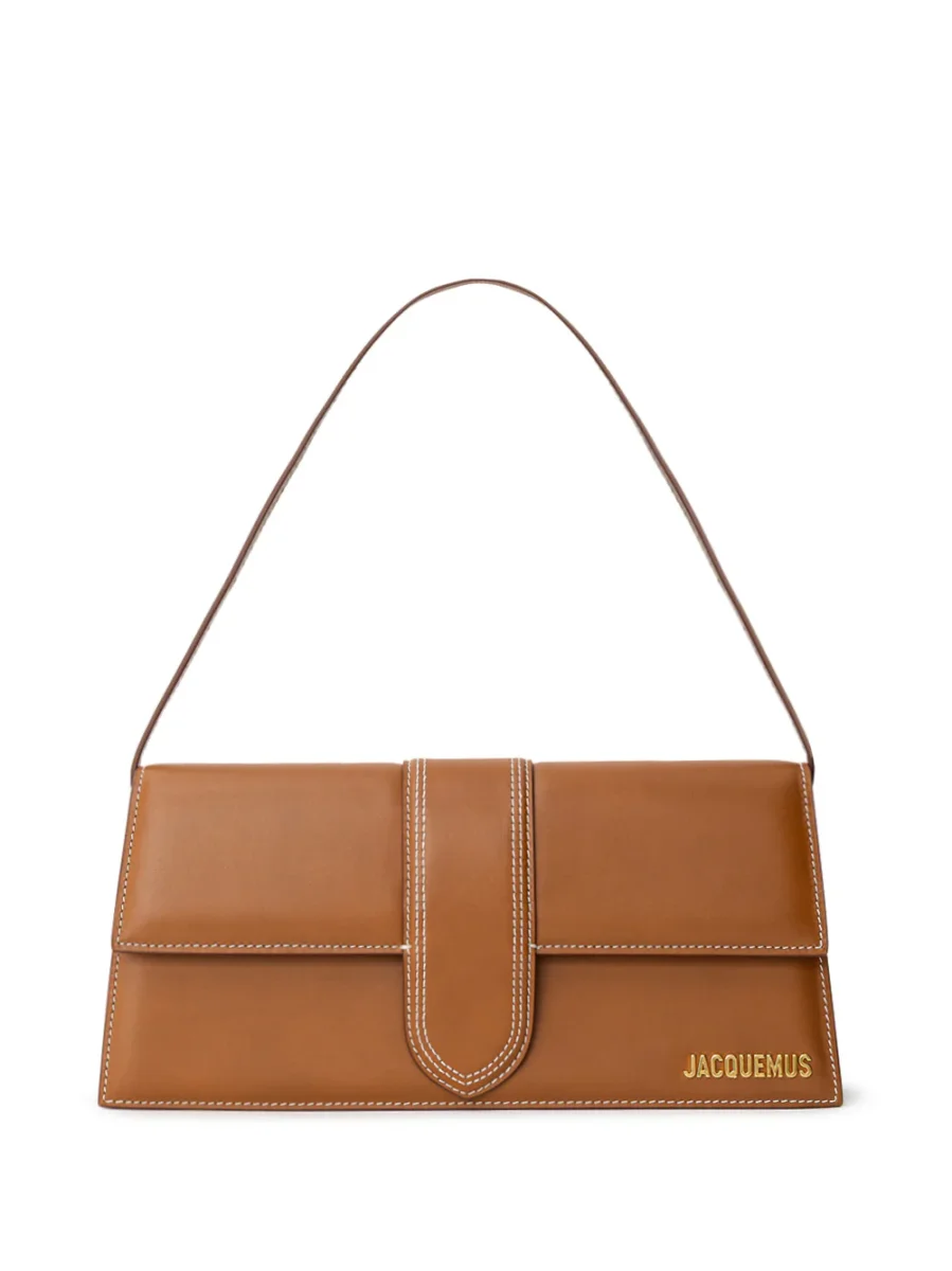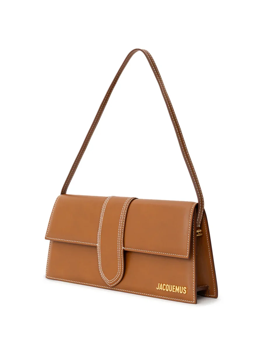 Borsa Le Bambino Long in Pelle Marrone Jacquemus. Apertura con bottone automatico coperto, unico scomparto interno con tasca, tracolla regolabile, tasca esterna posteriore