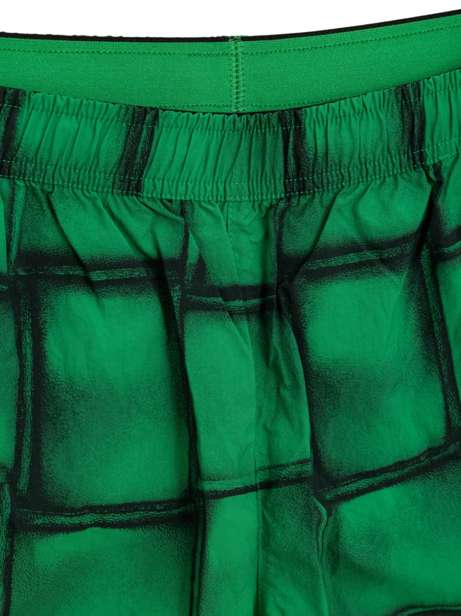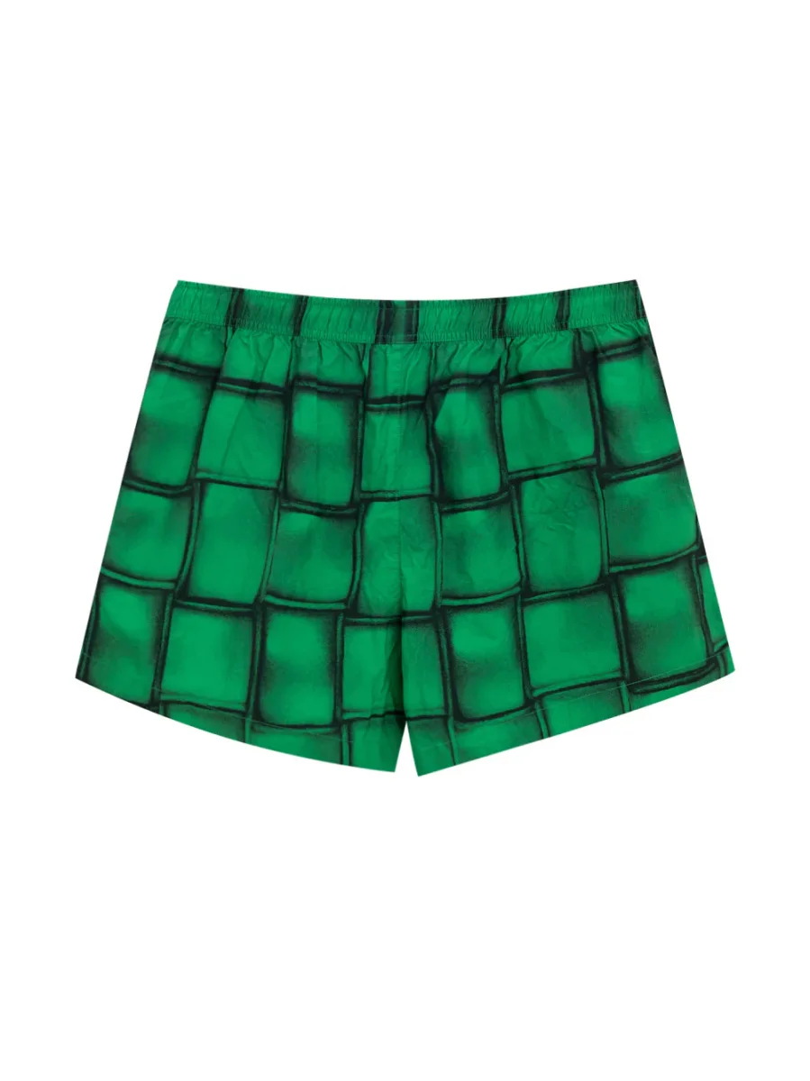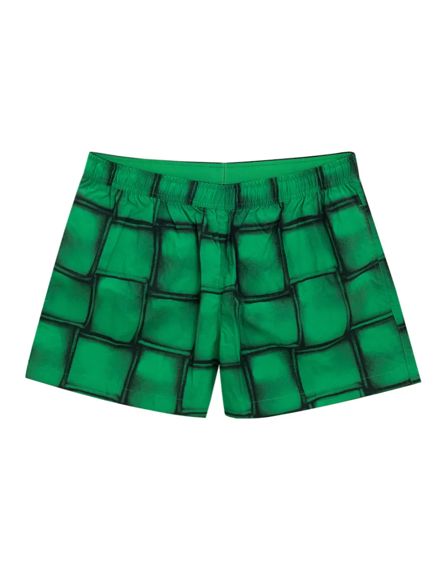Boxer Mare con Stampa Cassette Bottega Veneta. Costume boxer in nylon verde con stampa iconica Cassette allover, elastico in vita con coulisse regolabile, due tasche laterali, rete interna.
