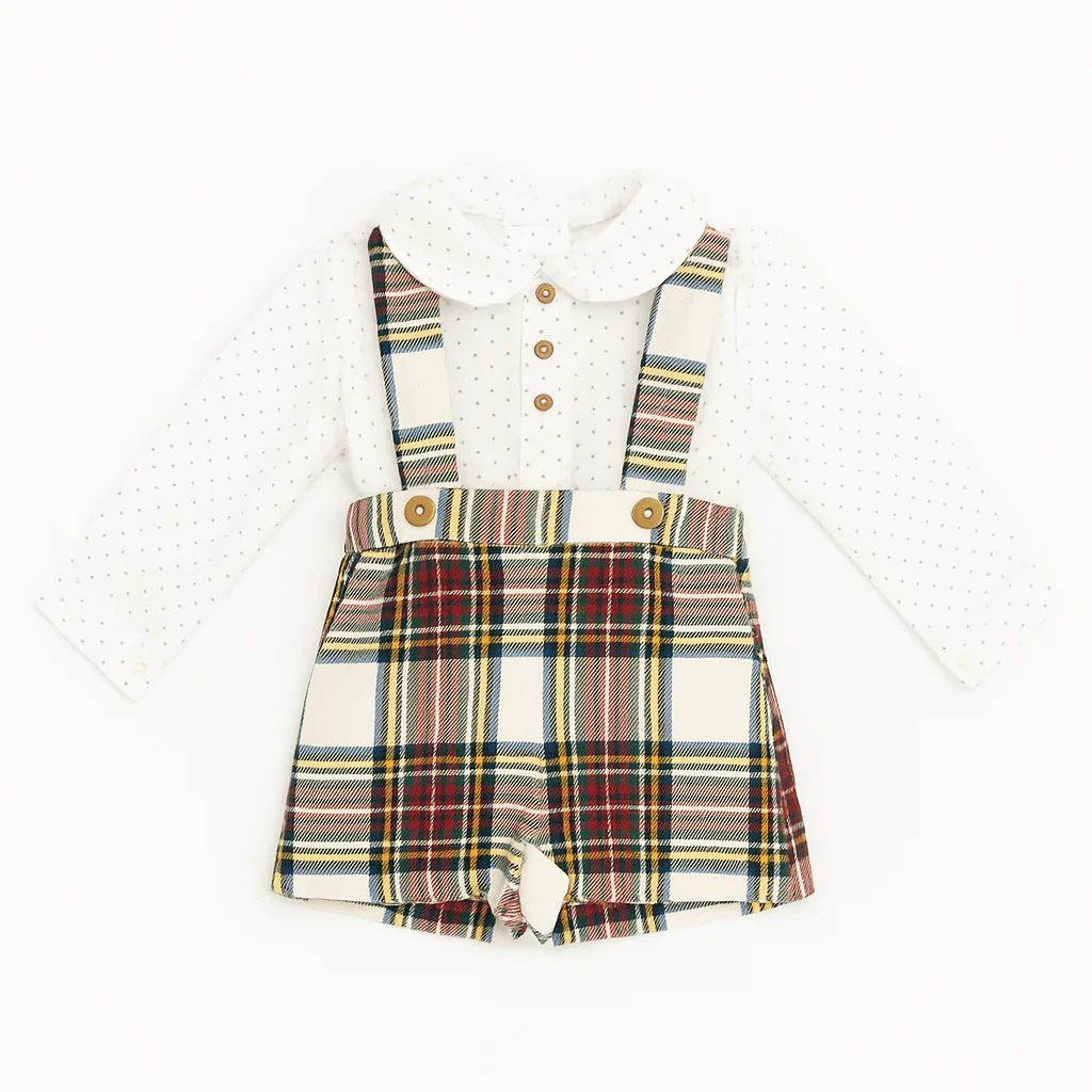 Completo con camicia bianca a micro pois con colletto, bottoncini frontali e polsini. Pantaloncino scozzese multicolore con bretelle applicate e vita elasticizzata.