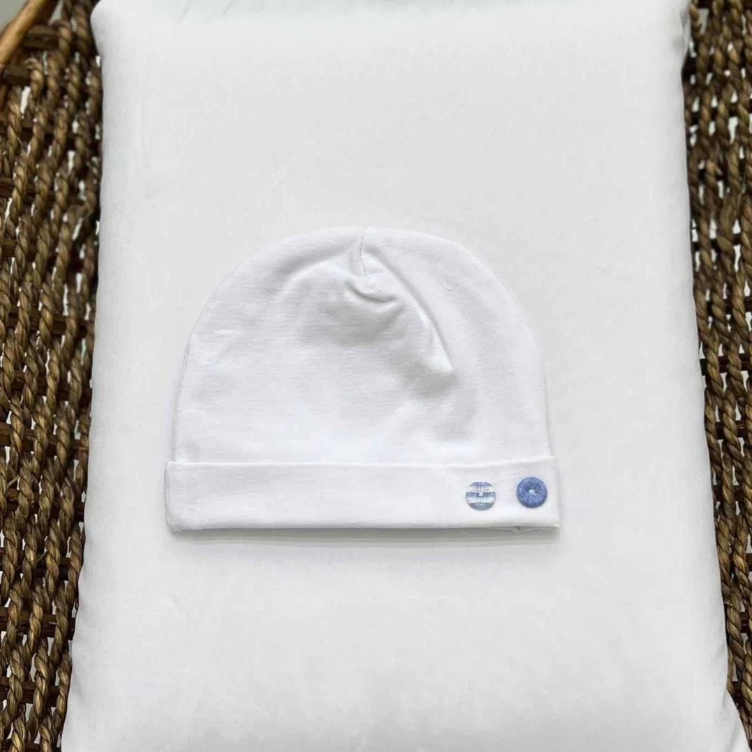 Cappellino neonato n cotone con dettaglio bottoncini blu.