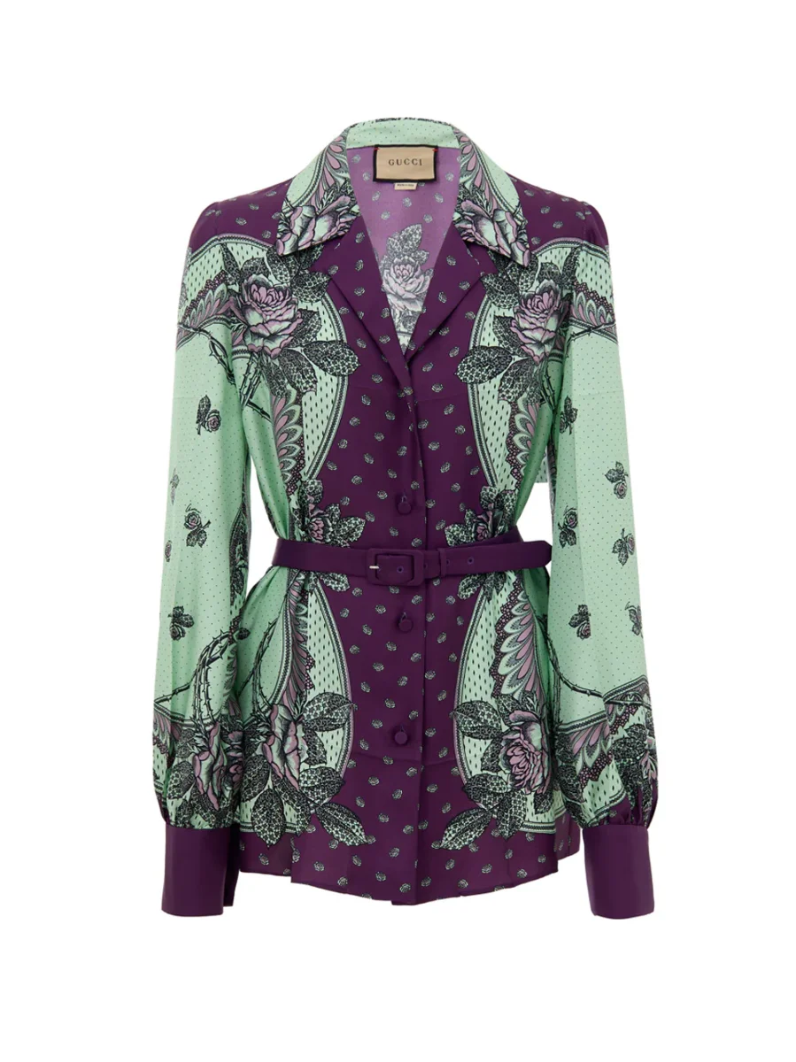 Camicia in Seta con Stampa Verde Menta e Viola Gucci.