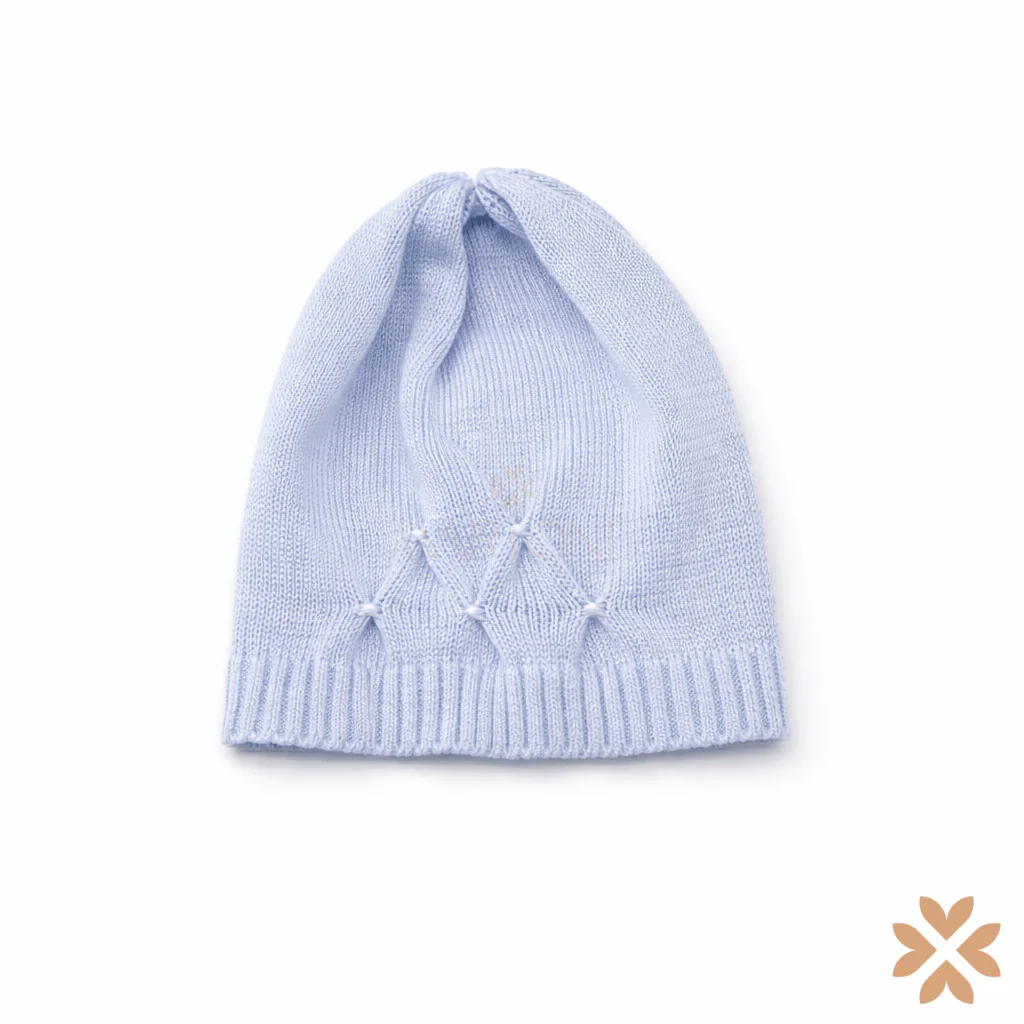 Cappellino in filo a maglia con lavorazione decorativa e risvolto a costine. Struttura morbida, ideale per corredino coordinato.