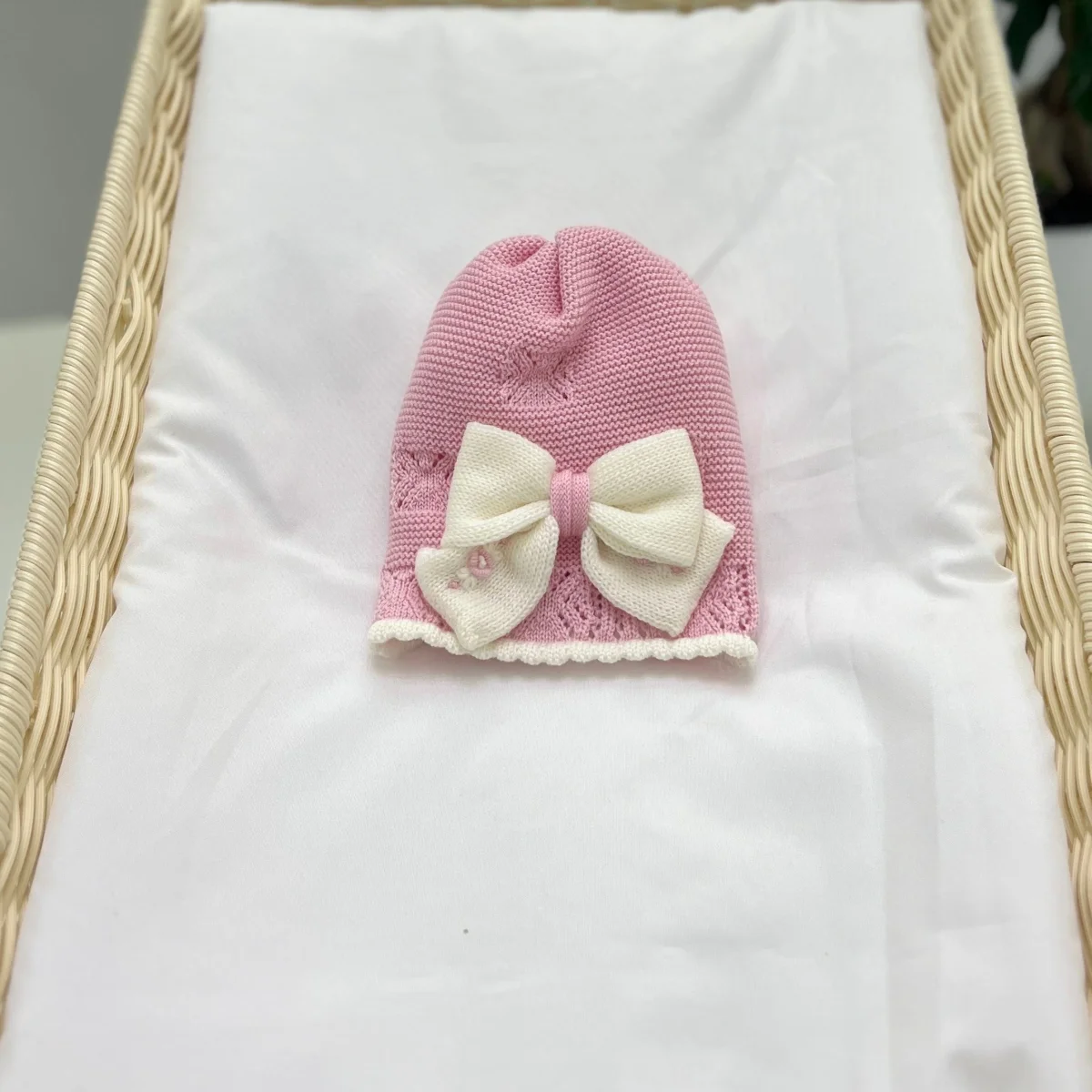 Cappellino in pura lana con fiocco.