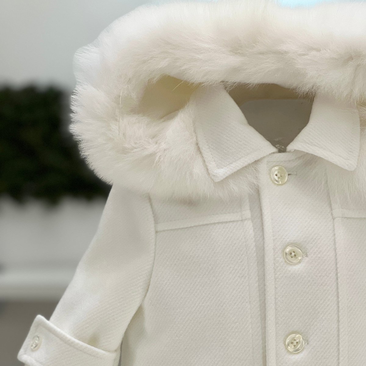 Cappotto in panno con bottoni in madreperla, tasche frontali in rilievo, cappuccio con ecopelliccia.