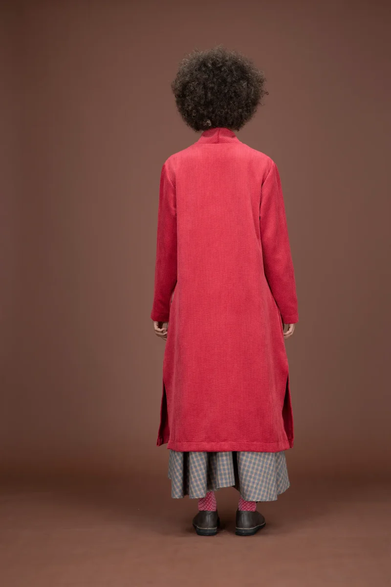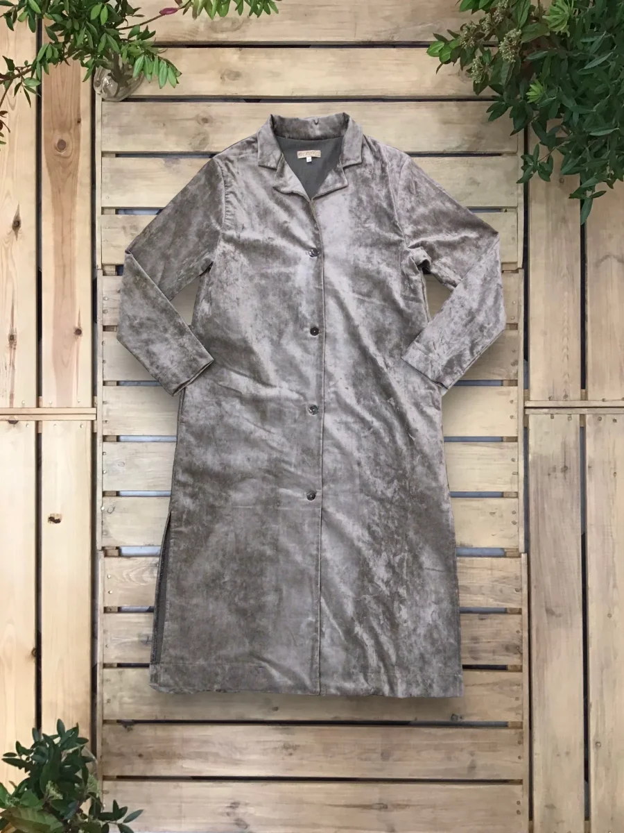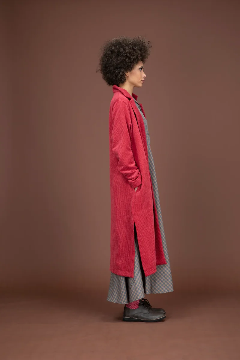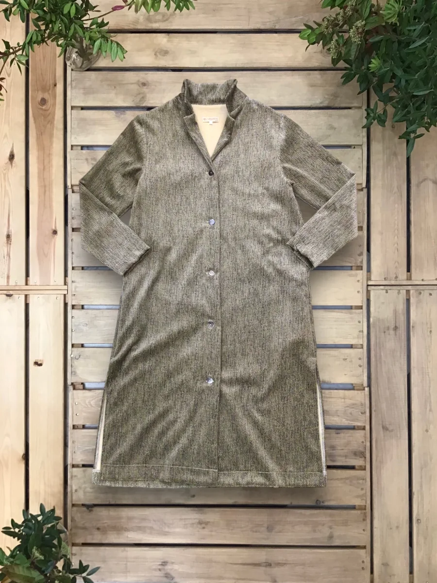 Cappotto a scatoletta lungo, sfoderato, con tasche e spacchi laterali. Bottoni di madreperla.