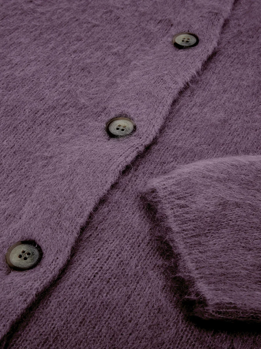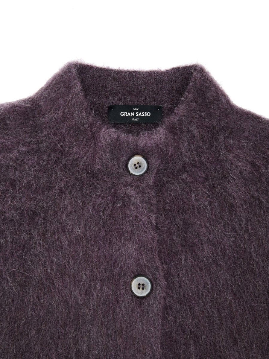 Cardigan con Colletto alla Corena in Bordeaux Gran Sasso. Modello boxy, colletto alto alla coreana, allacciatura frontale con bottoni, in mIsto lana alpaca, morbido al tatto.