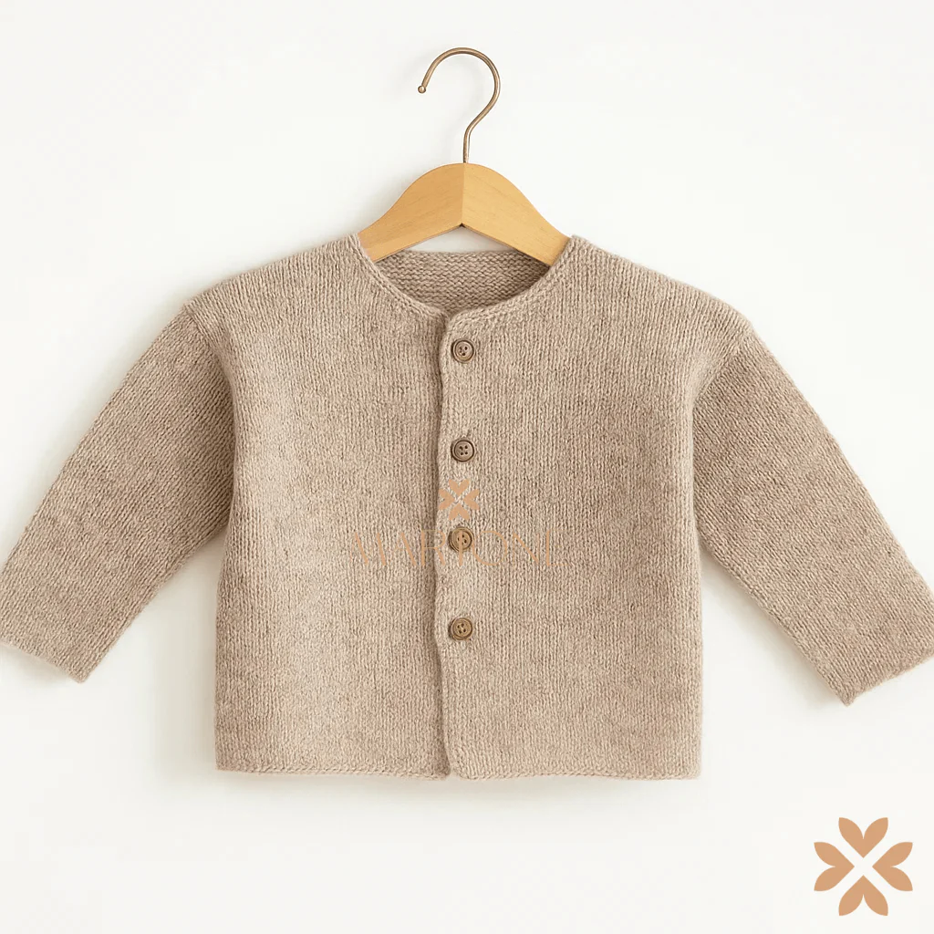 Cardigan in maglia beige melange con maniche lunghe, scollo tondo e apertura frontale con bottoni in legno. Rifinito con bordi dritti su fondo e polsini.