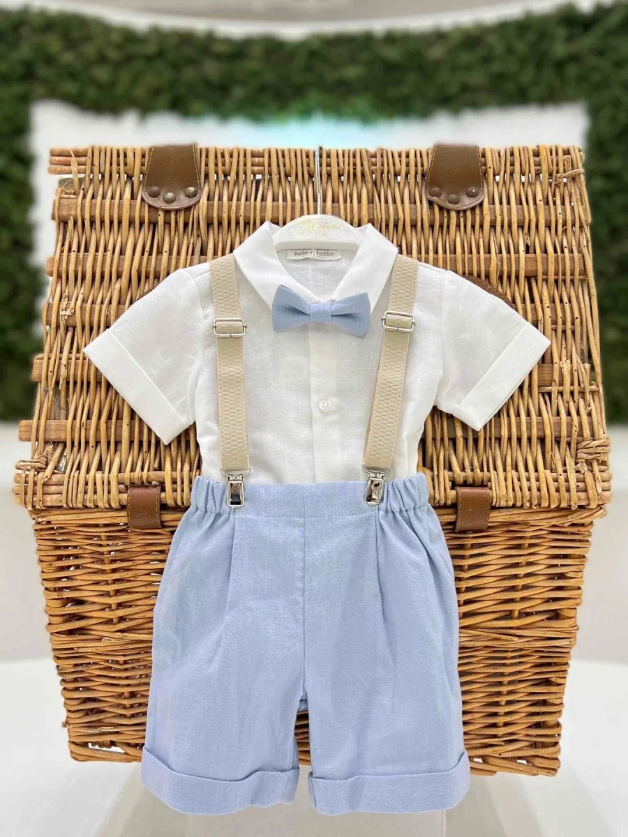 Completo bimbo due pezzi con camicia in lino a manica corta, bermuda in lino azzurro, papillon e bretelle beige.