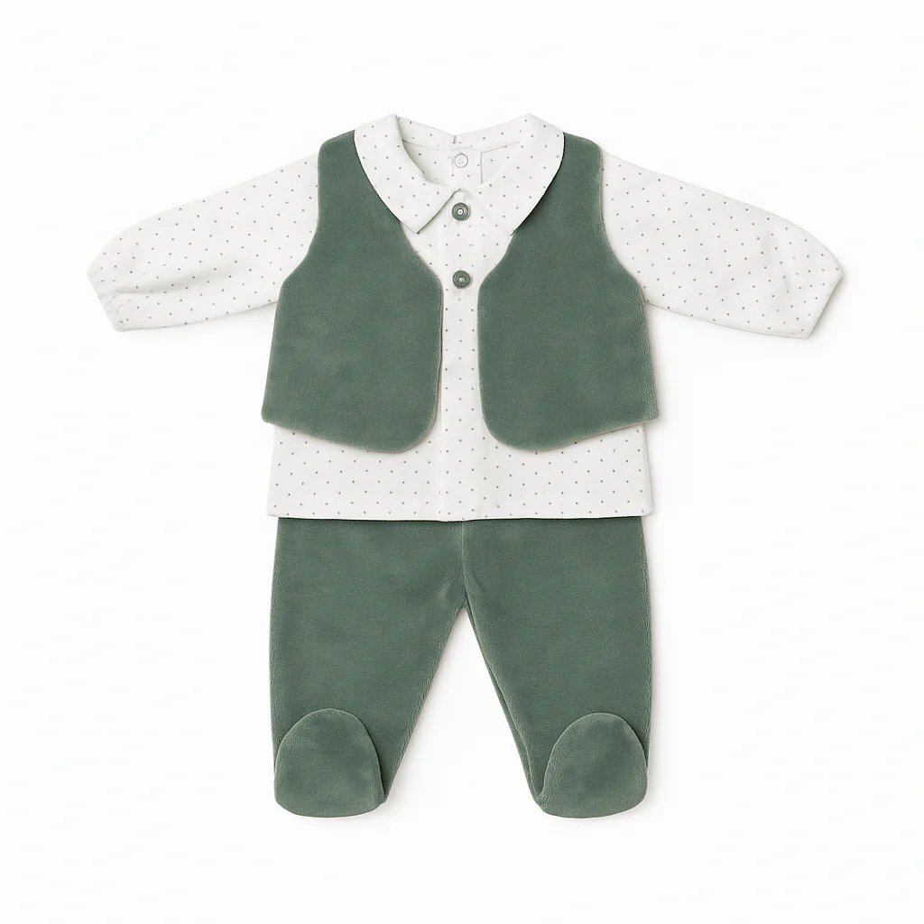 Completo due pezzi: camicina in interlock con micro pois e colletto, chiusura posteriore con bottoni a pressione. Gilet e pantaloni in ciniglia verde con piedini integrati ed elastico morbido in vita.