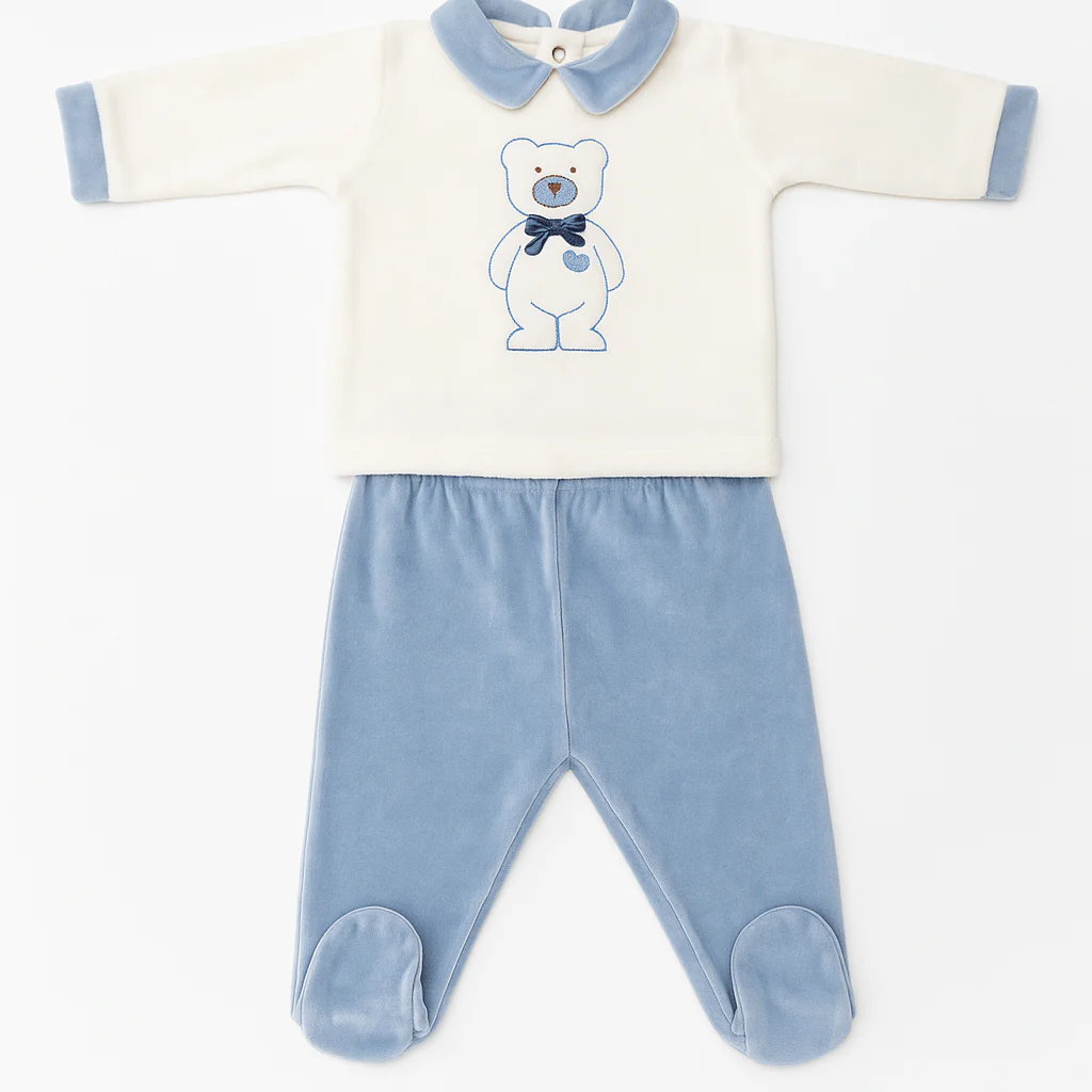 Tutina spezzata in ciniglia bianca con colletto e polsini azzurri, ricamo orsetto frontale e chiusura a pressione sul retro. Pantaloni in ciniglia azzurra con piedini integrati ed elastico morbido in vita.