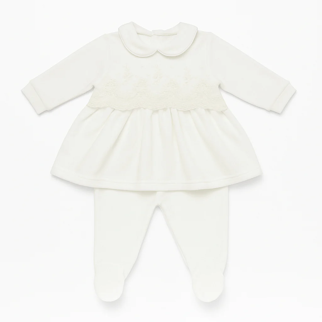 Completino in due pezzi con maglia in ciniglia panna, colletto tondo e ricamo tono su tono sul corpino. Abbinato a pantaloni con piedini coordinati. Chiusura della maglia con bottoncini a pressione sul retro
