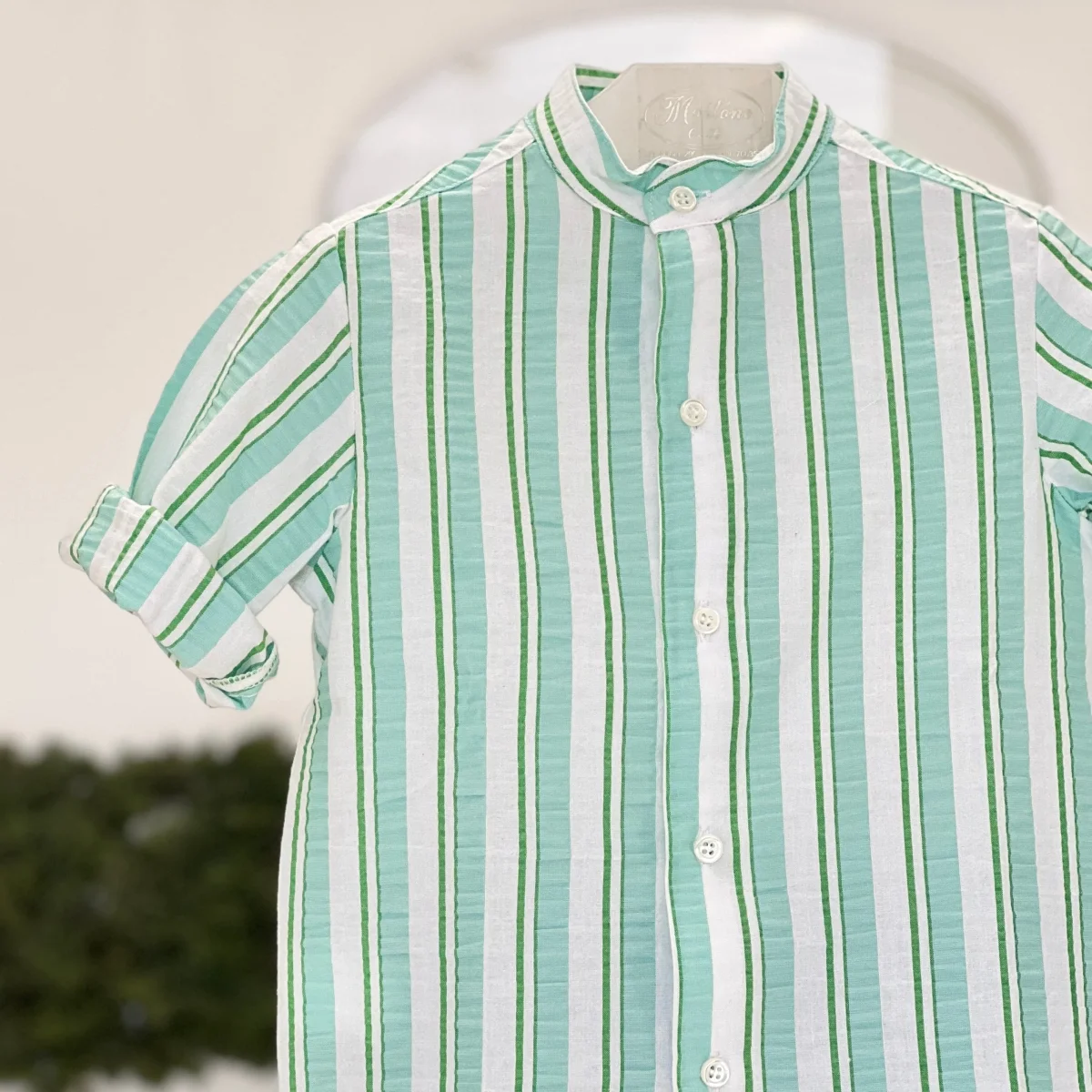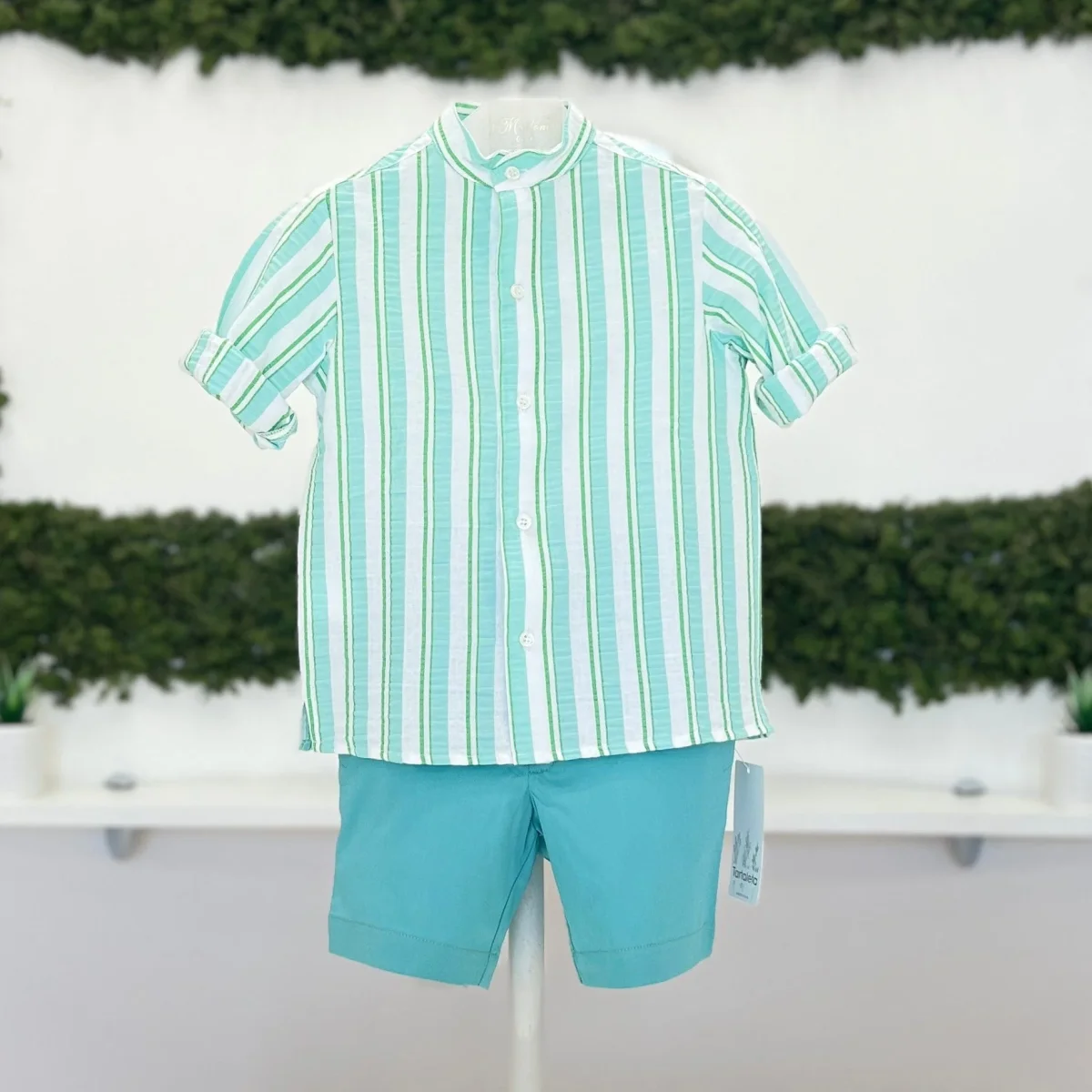 Completo bimbo con camicia a righe e collo coreano, abbinata a bermuda in tinta unita coordinata.