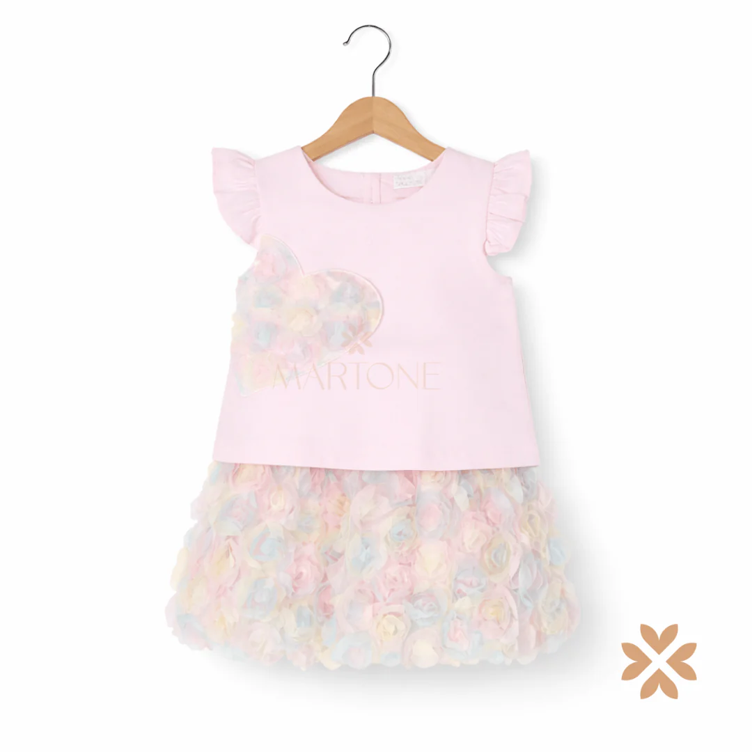 Completo due pezzi per neonata composto da maglia con maniche ad aletta e applicazione a cuore sul davanti. Gonna coordinata con lavorazione floreale tridimensionale. Chiusura posteriore. Vestibilità regolare.