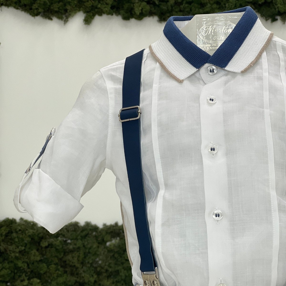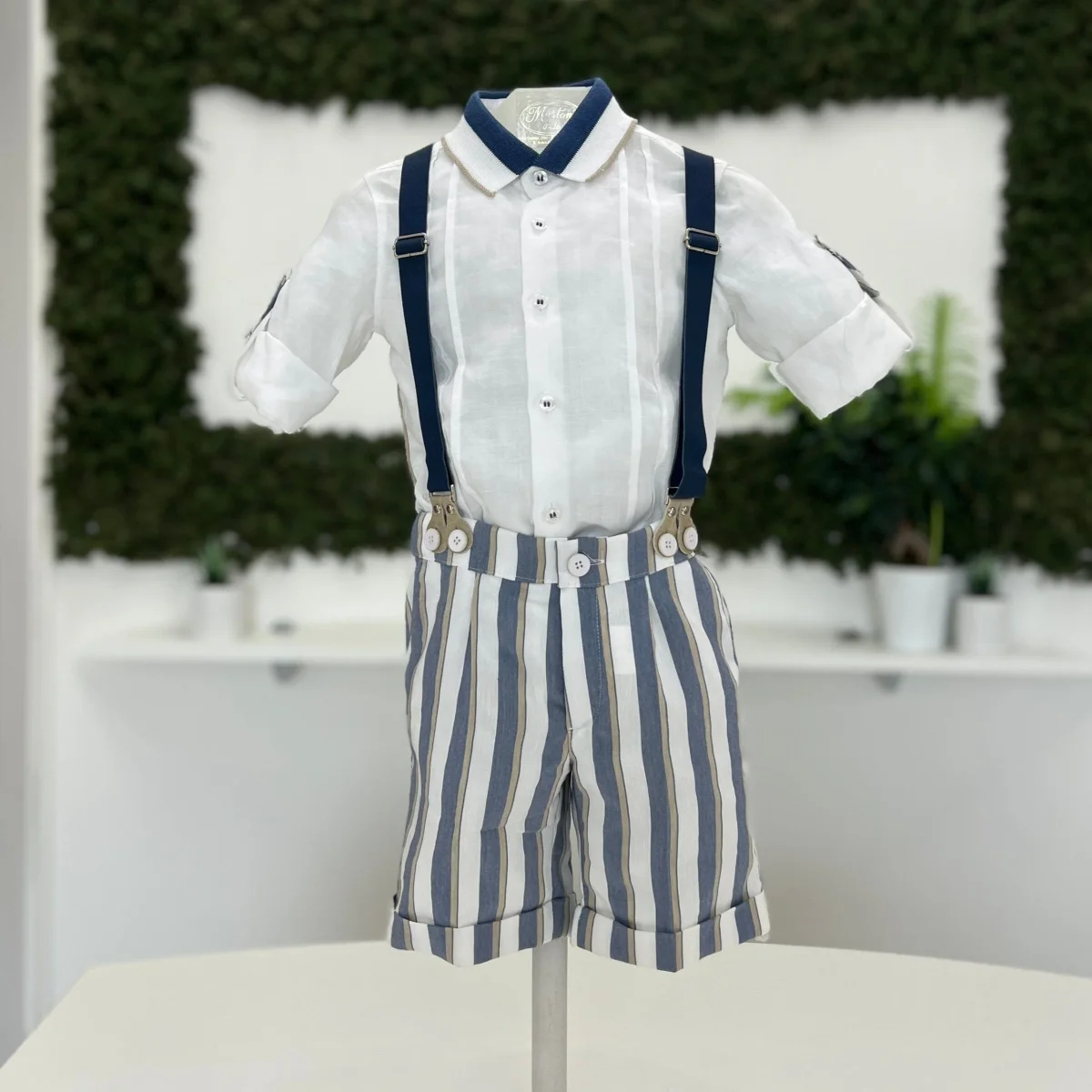 Completo bimbo, bermuda a righe con bretelle removibili, camicia coordinata con colletto a contrasto e maniche con risvolto