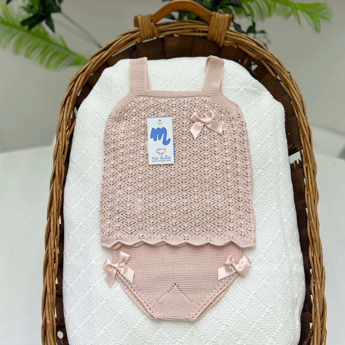Completo in filo di cotone traforato, composto da blusa con spalline e culotte con fiocchetti. Un look delicato e raffinato, perfetto per le occasioni speciali.