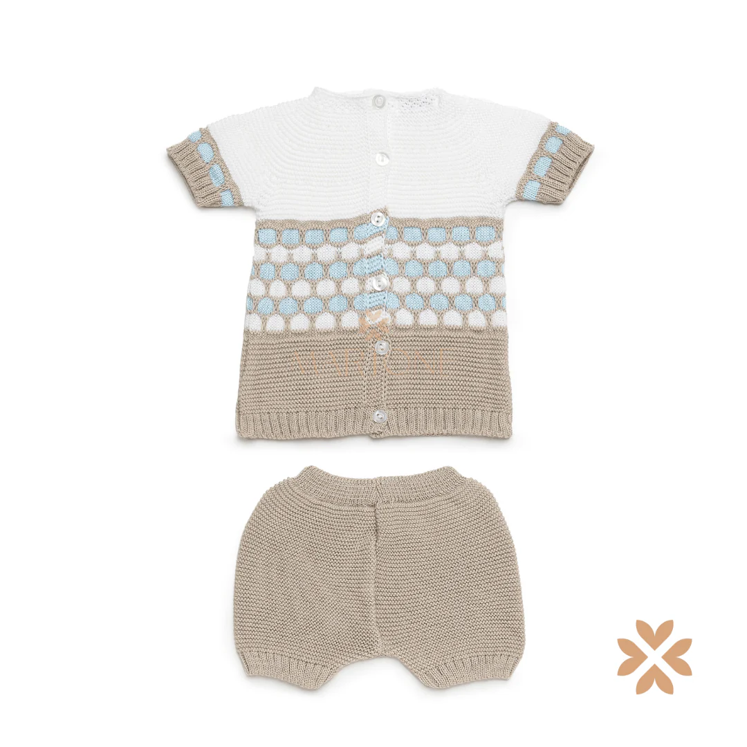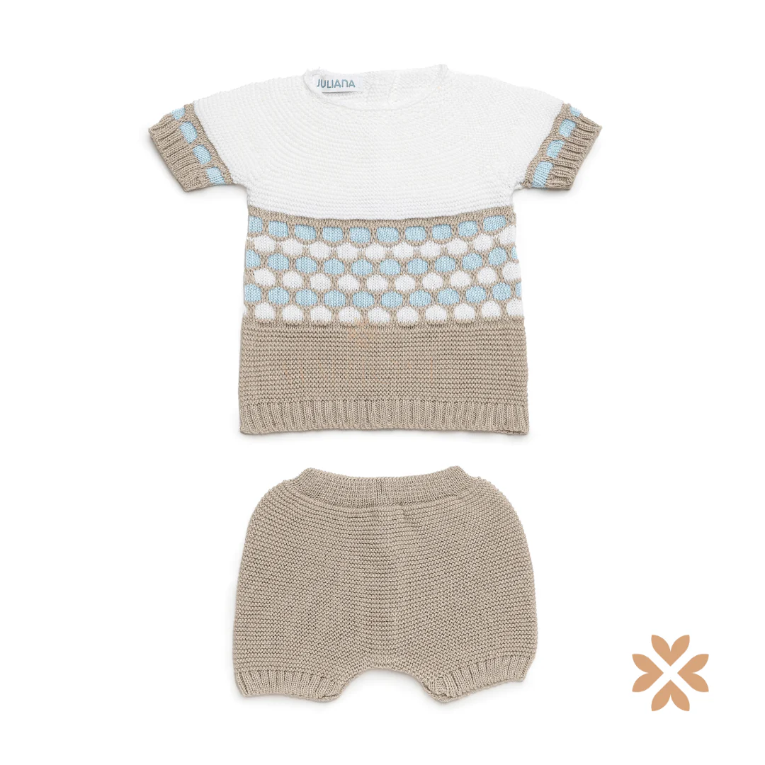 Completo in filo di cotone corto, manica corta e fantasia a contrasto, coordinati pantaloncini con bordi a coste.