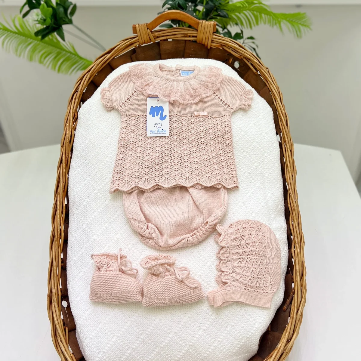 Completo corto per neonata in filo di cotone e pizzo, composto da maglia con colletto e rouches, culotte, babbucce e cuffia abbinate. Un insieme elegante e delicato, ideale per le occasioni speciali.