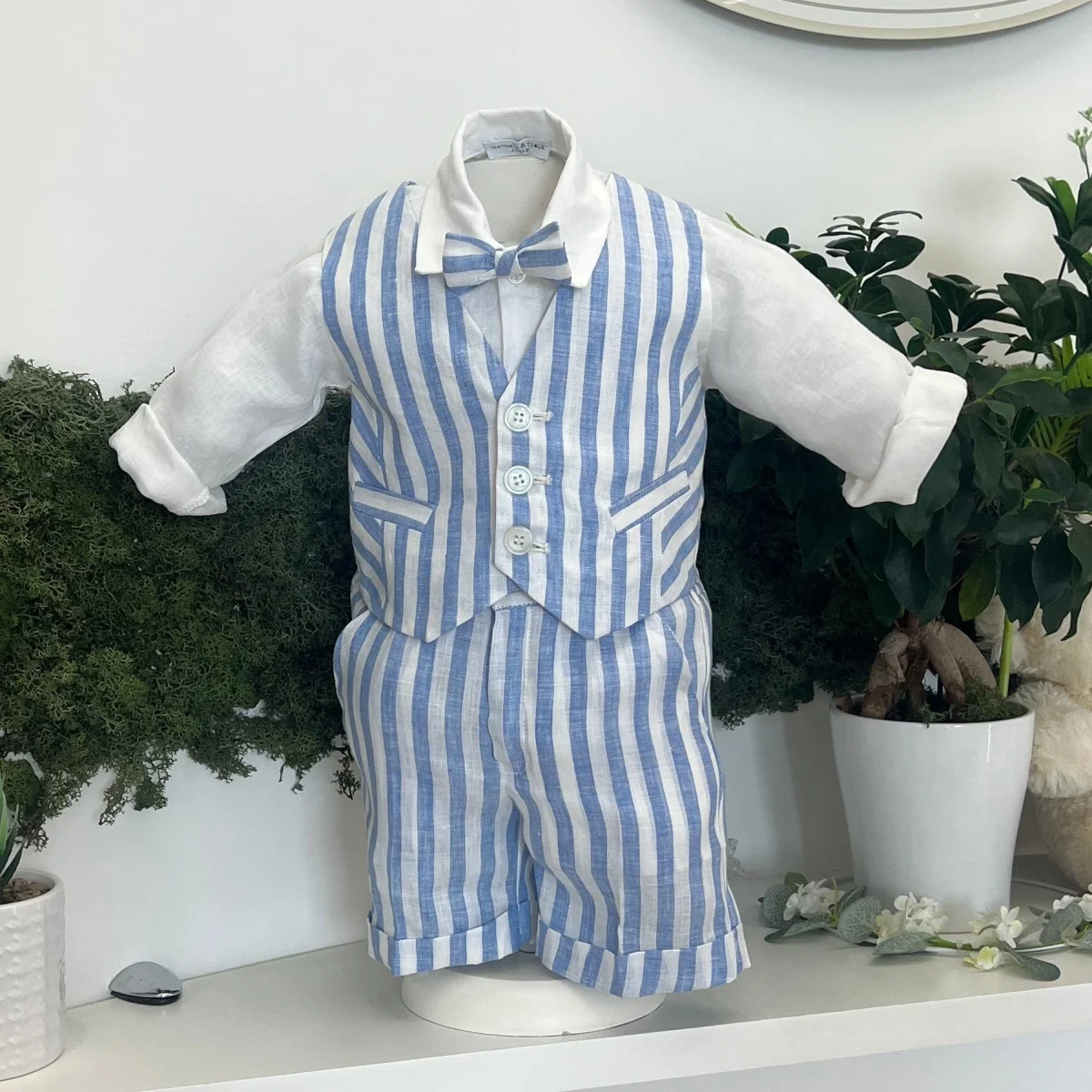 Completo elegante in lino composto da pantalone e gilet in lino a righe, con camicia coordinata in lino con risvolti, papillon coordinato.