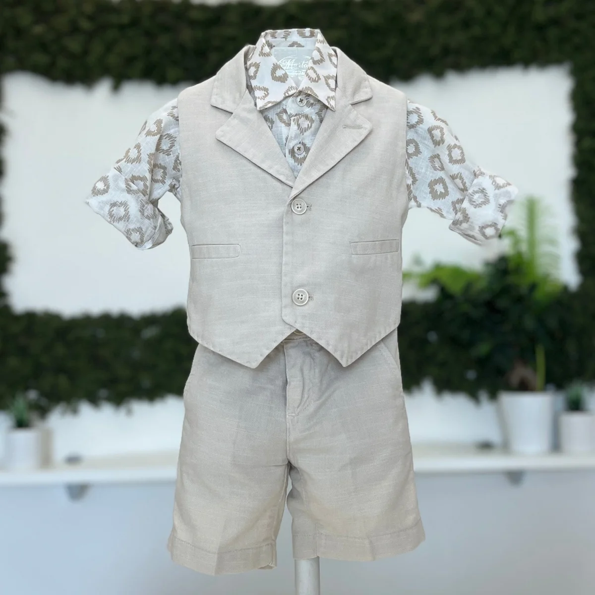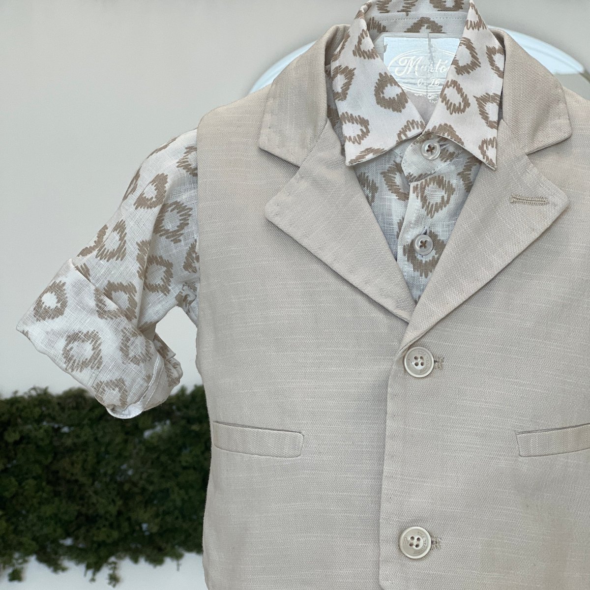 Completo elegante in lino composto da gilet e bermuda azzurri abbinati a una camicia in lino con stampa coordinata. Fresco, raffinato e perfetto per cerimonie ed eventi speciali.