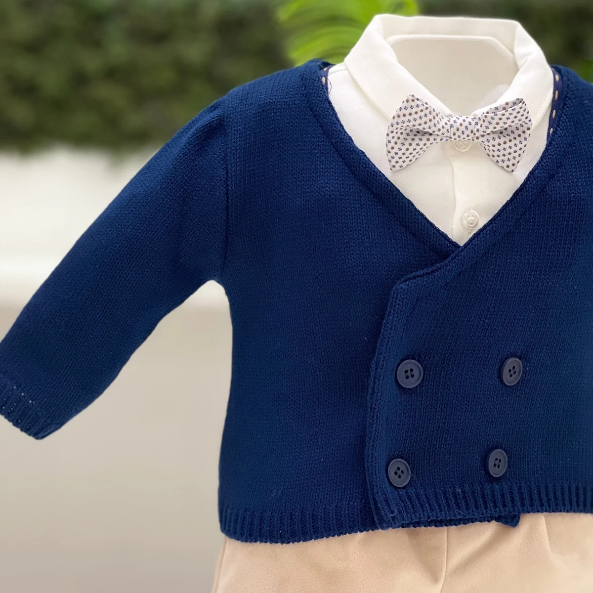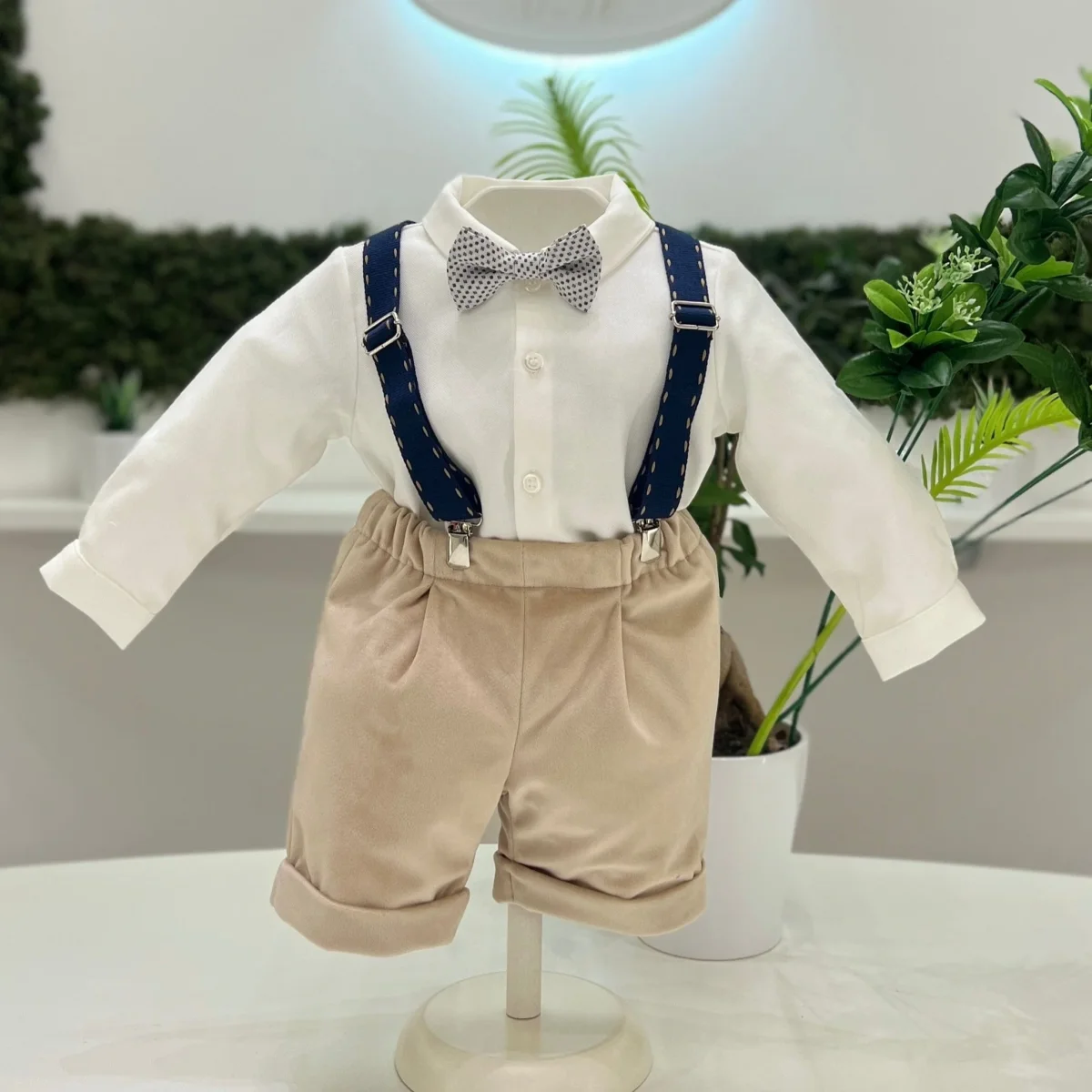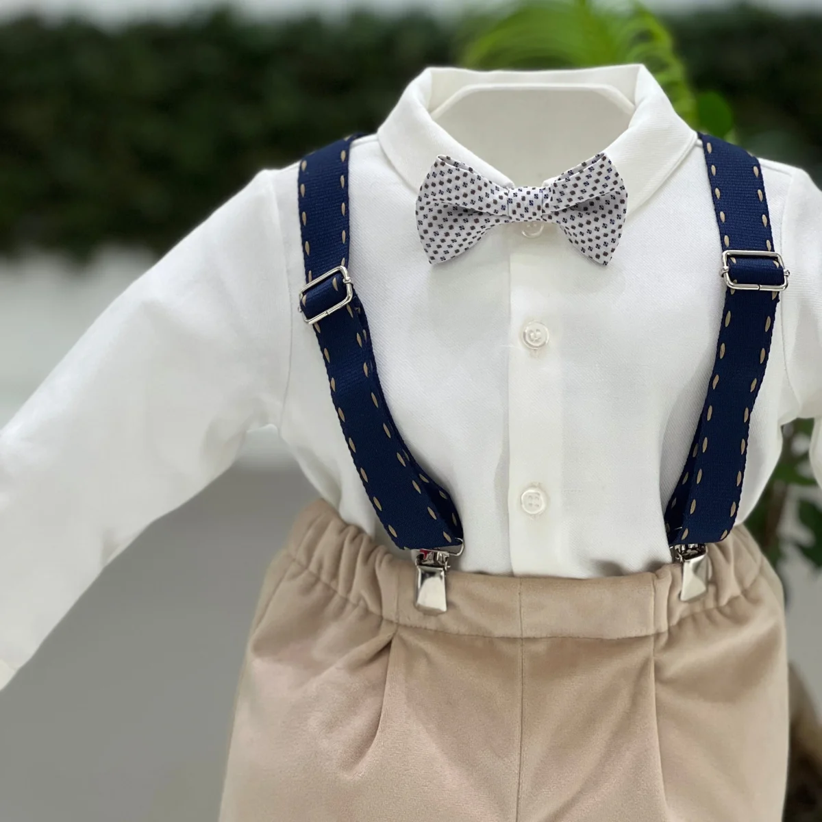 Un elegante completo per bimbo che include pantaloni color nocciola in velluto, camicia body in cotone rigato per un tocco di freschezza e comfort, e bretelle coordinate che aggiungono un dettaglio classico. Il papillon completa il look con un tocco di raffinatezza, rendendo il completo ideale per occasioni speciali.