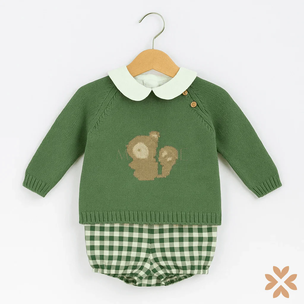 Completo tre pezzi per bimbo con maglione in maglia verde decorato da ricamo scoiattolo sul davanti, camicia bianca con colletto tondo e pantaloncini in tessuto vichy verde con elastico morbido in vita e sul girocoscia.
