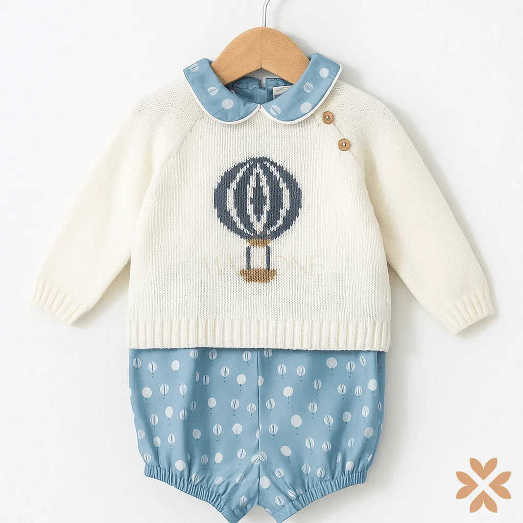 Completo tre pezzi composto da maglione in maglia panna con motivo a mongolfiera, camicia in cotone azzurro a pois con colletto tondo e pantaloncino coordinato con stampa di mongolfiere, rifinito da elastico in vita e sul girocoscia.