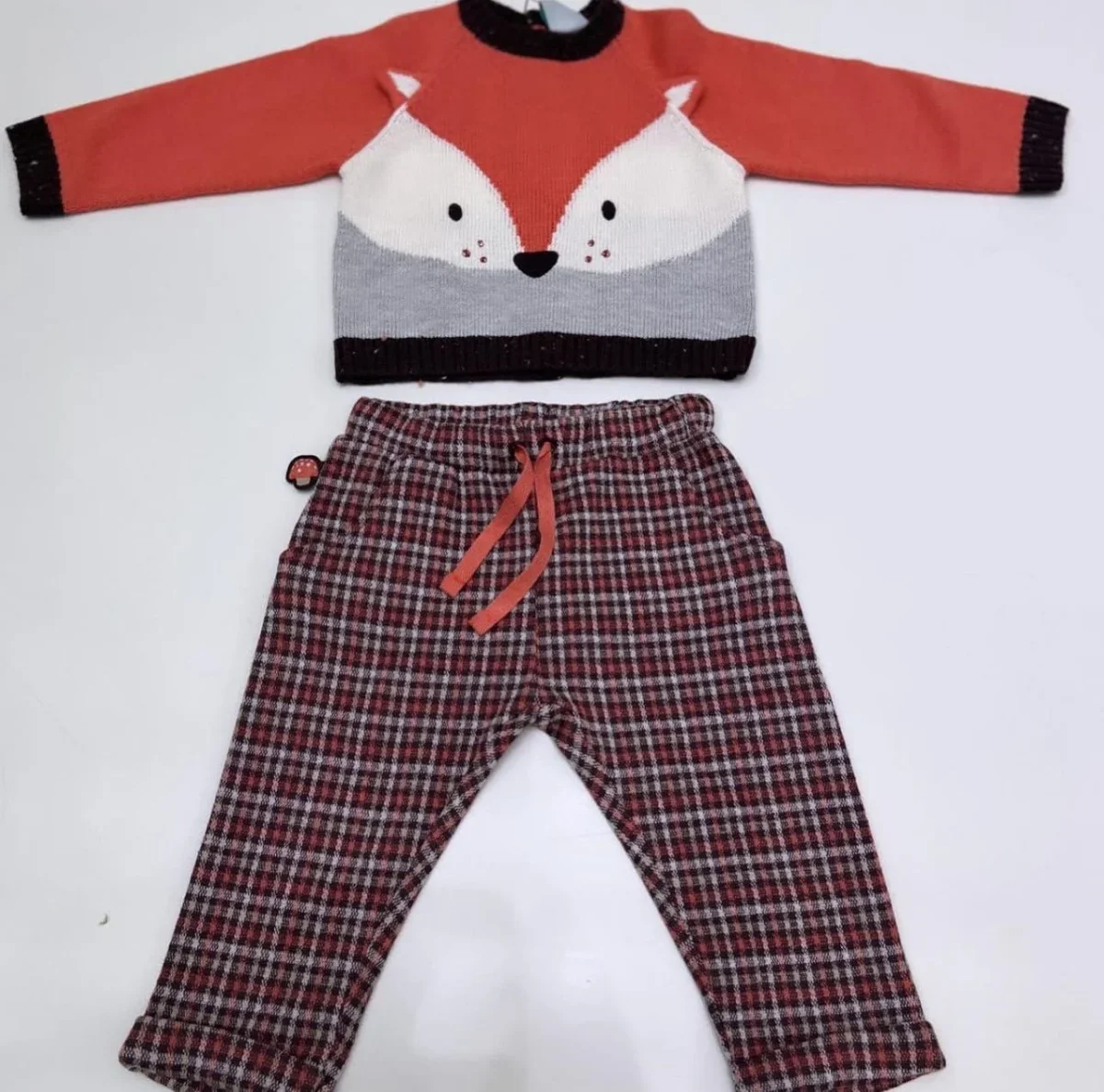 Completo due pezzi, maglia in misto lana e pantalone felpato con elastico.