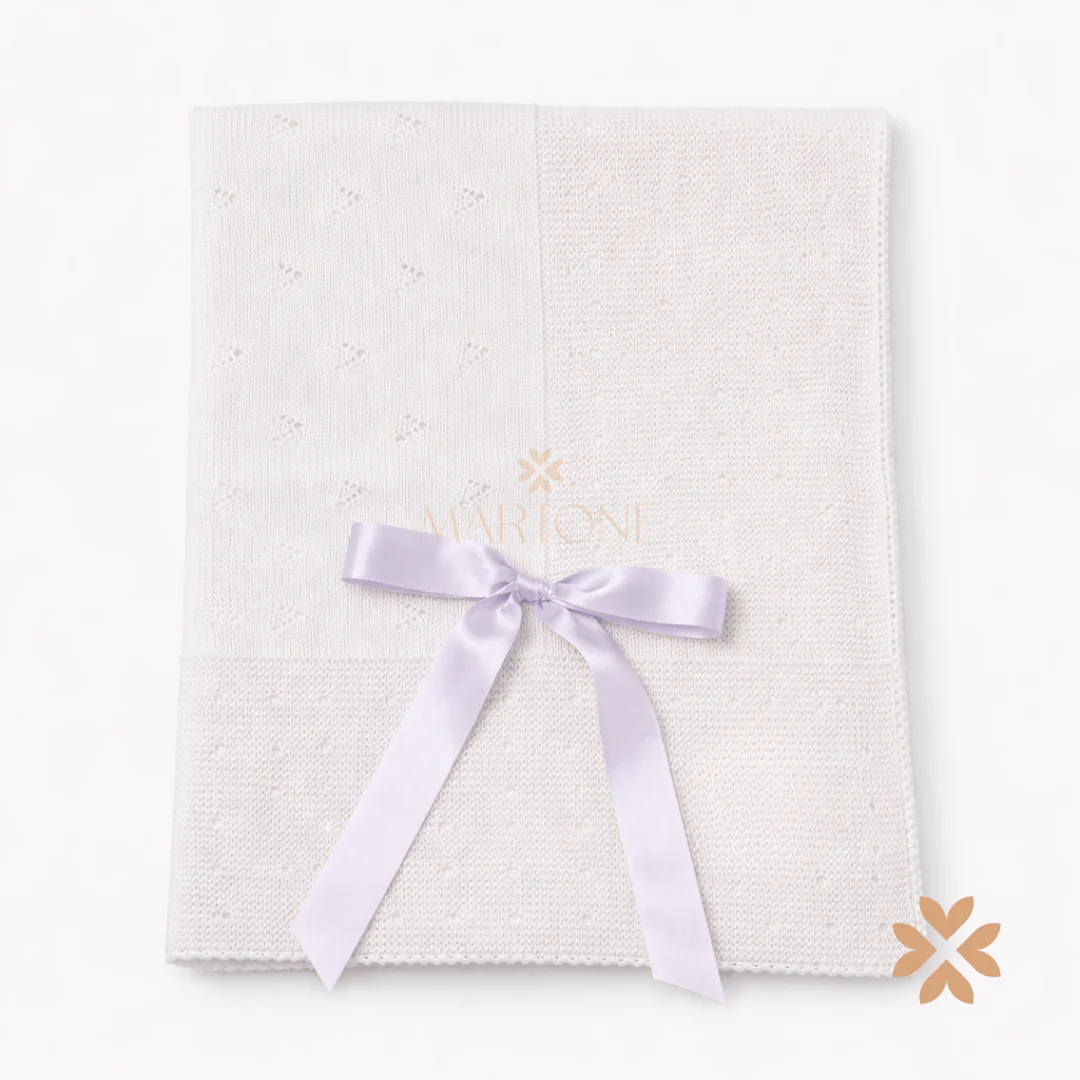 Coperta per neonati in filo di cotone caratterizzata da trama traforata con fiocco in raso.
