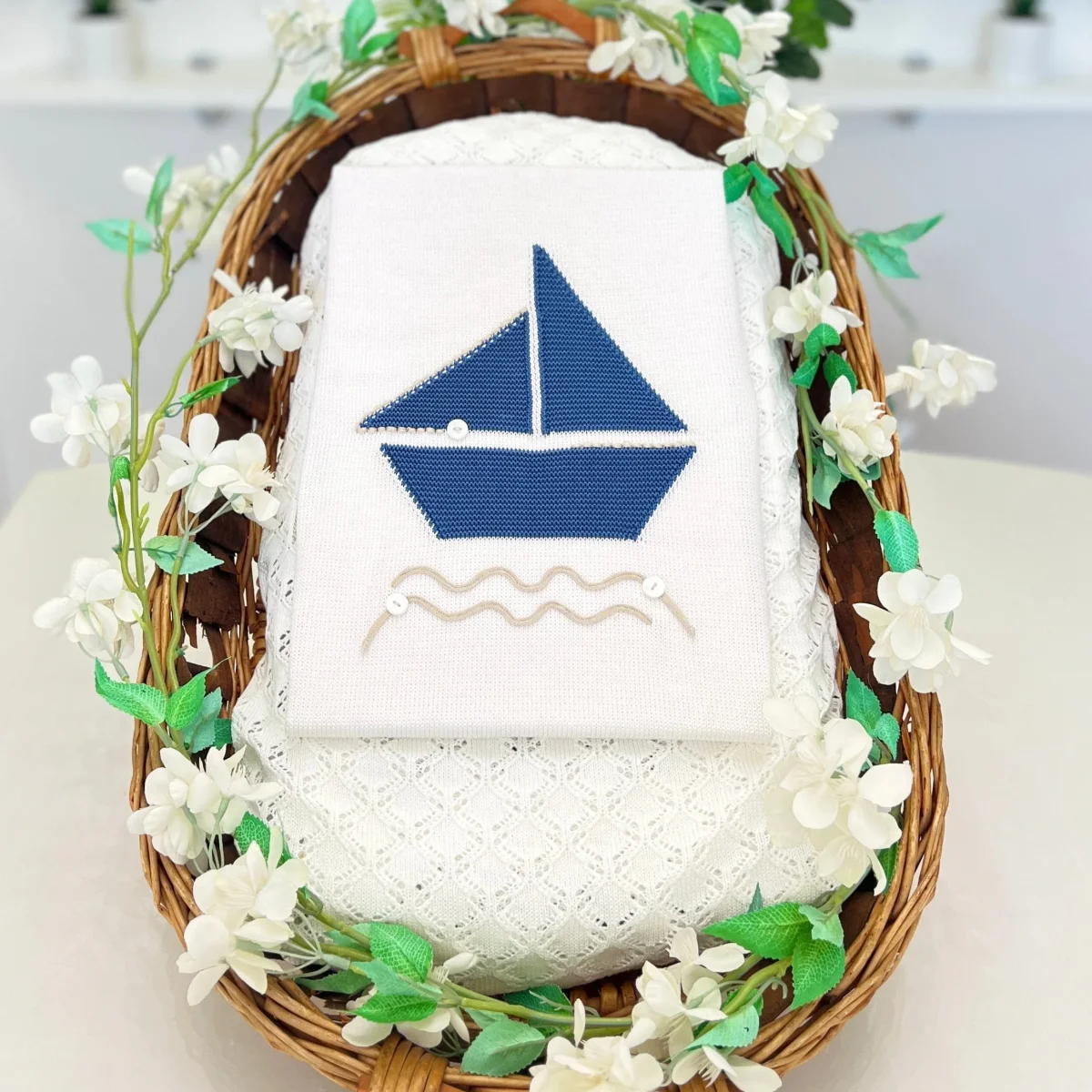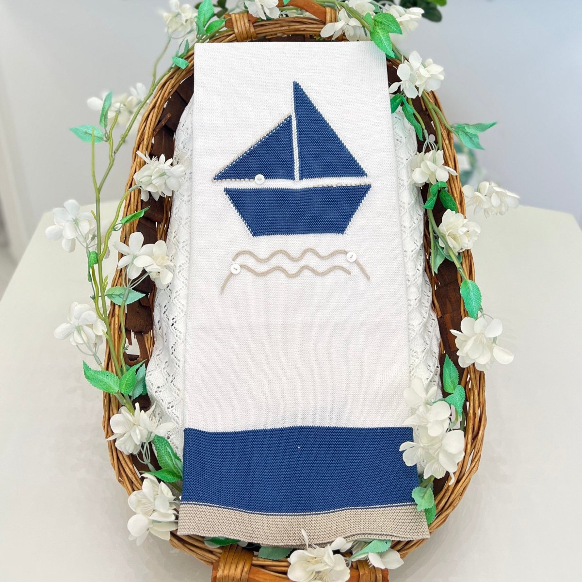 Coperta in filo di cotone per neonato, con elegante dettaglio centrale. Leggera e delicata, ideale per le stagioni primaverili ed estive, perfetta per avvolgere il tuo piccolo con stile e comfort.