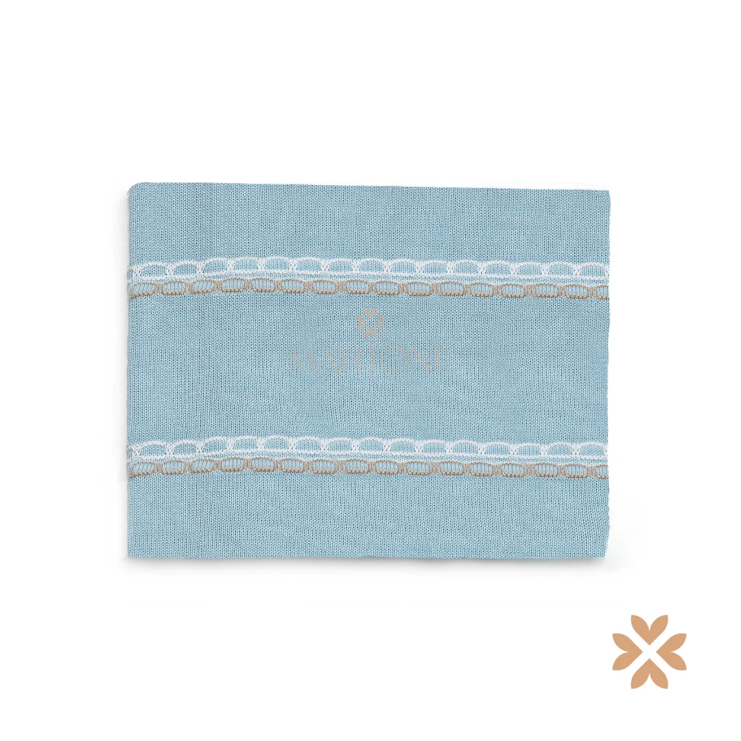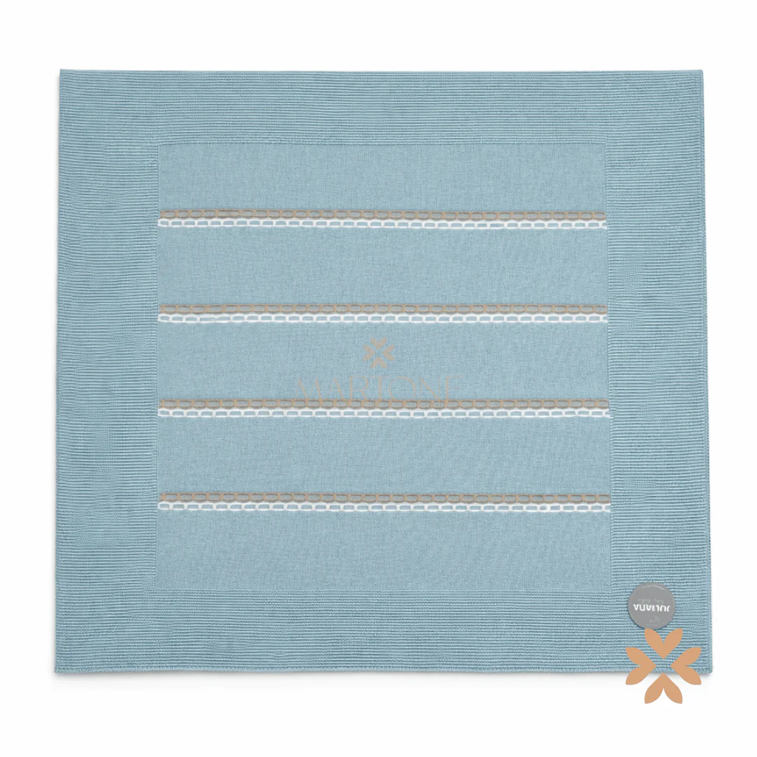 Coperta in filo di cotone, lavorazione a maglia con struttura a trama compatta. Inserto centrale in tessuto con motivo a righe orizzontali e dettagli decorativi a contrasto.