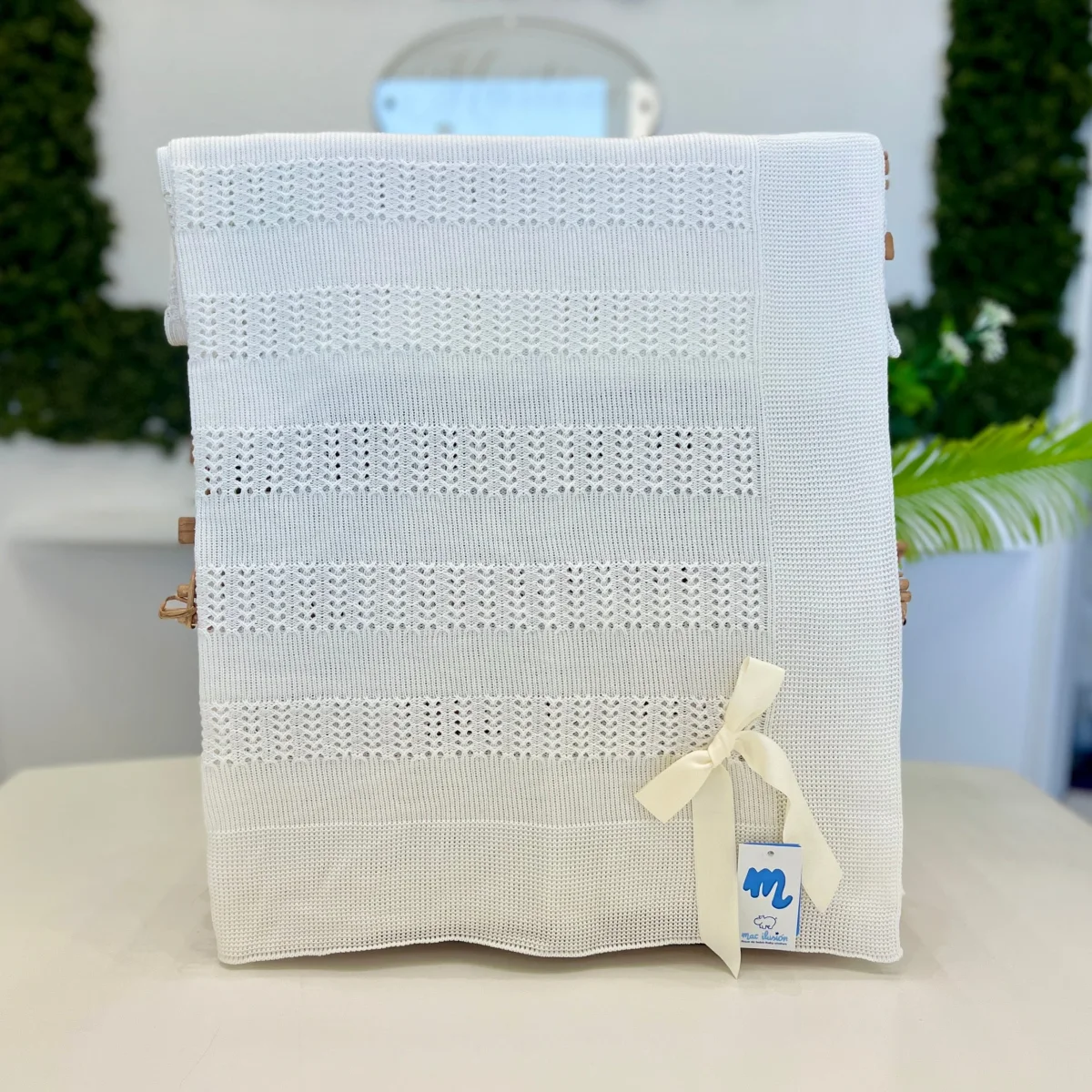 Coperta in filo di cotone con trama traforata a righe e fiocco. Elegante e morbida, perfetta per avvolgere i tuoi piccoli con stile e comfort.
