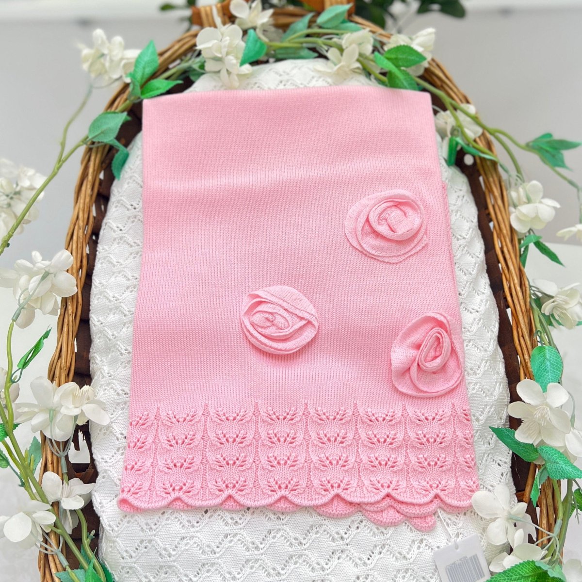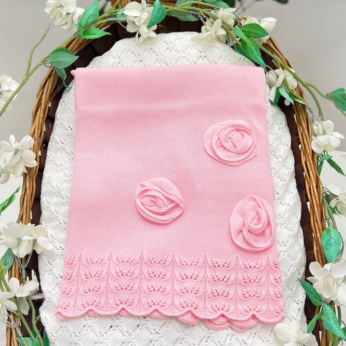 Copertina per neonata in filo di puro cotone, lavorata all’uncinetto con bordi smerlati e raffinati trafori. Arricchita da delicate roselline, perfetta per avvolgere la neonata con eleganza e dolcezza.