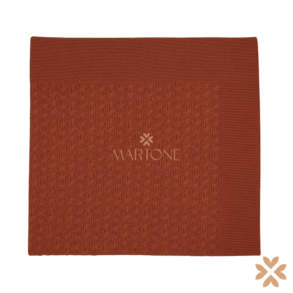 Coperta in maglia color mattone, caratterizzata da una lavorazione a rilievo e bordo a costa larga. Morbida e avvolgente, è perfetta per accompagnare il neonato nei momenti di riposo, aggiungendo un tocco caldo ed elegante al corredino.