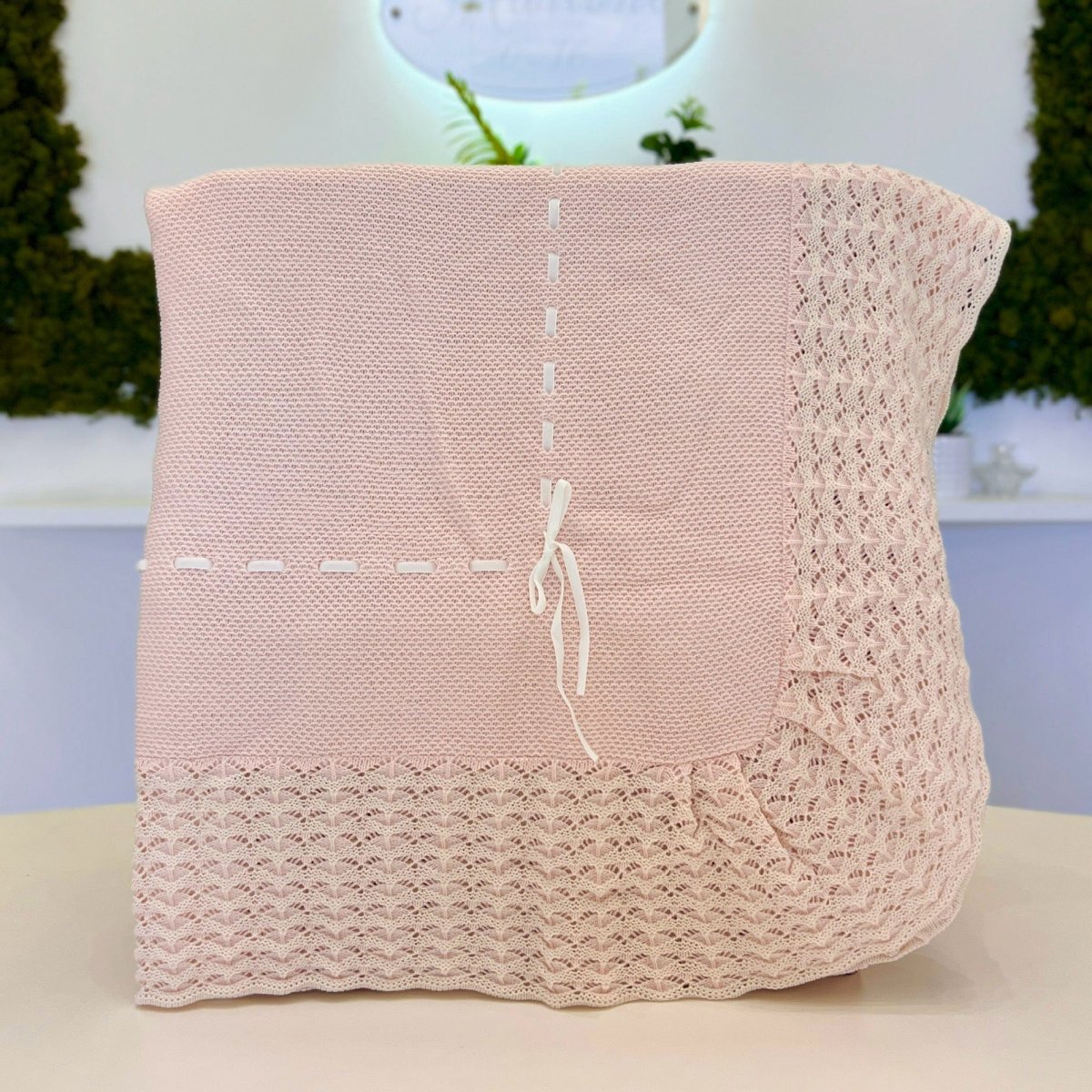 Coperta in misto lana smerlata con passanastro.
