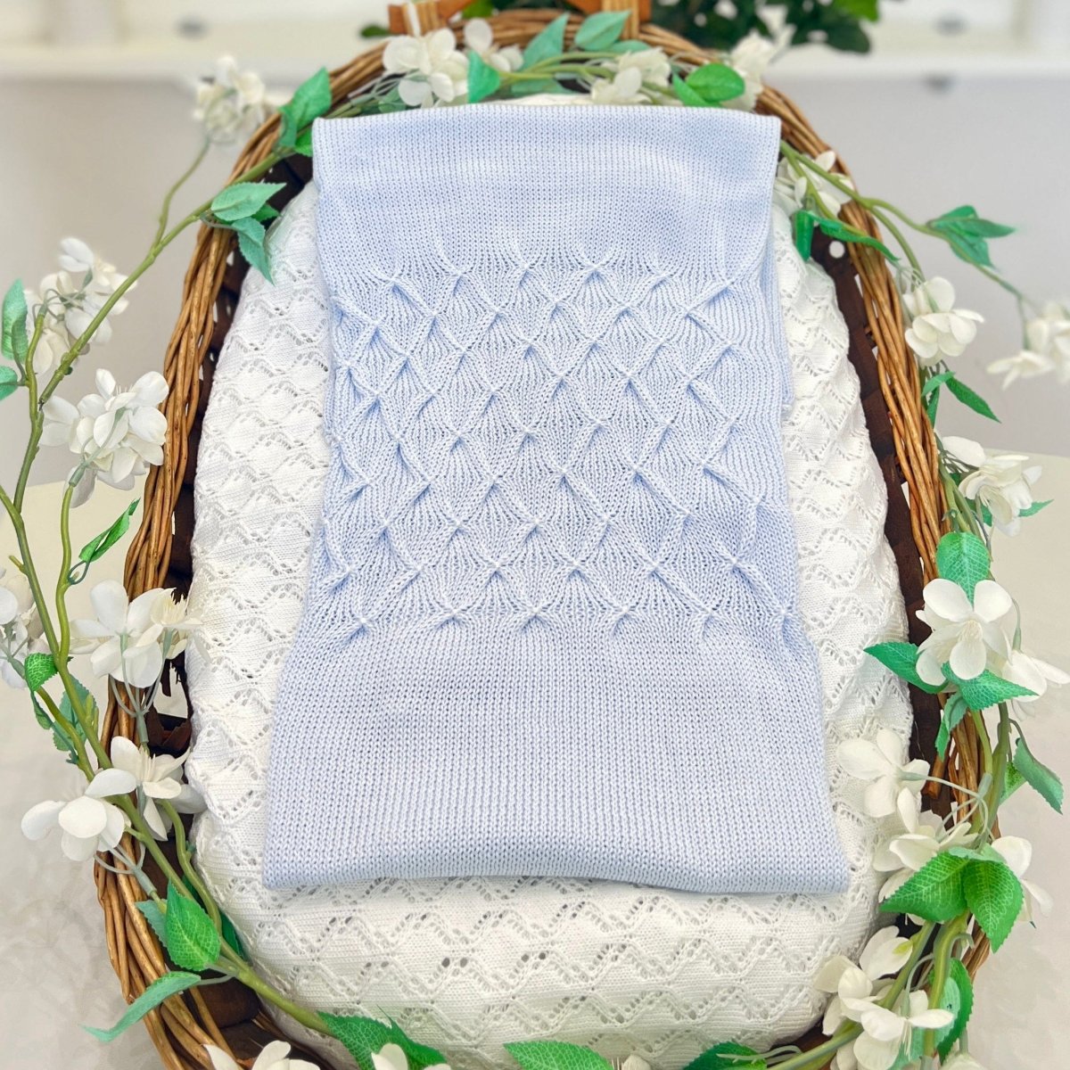 Copertina in filo di cotone celeste chiaro, lavorata a maglia con dettaglio in punto smock e piccoli nodini. Morbida e traspirante, pensata per avvolgere il neonato con delicatezza.