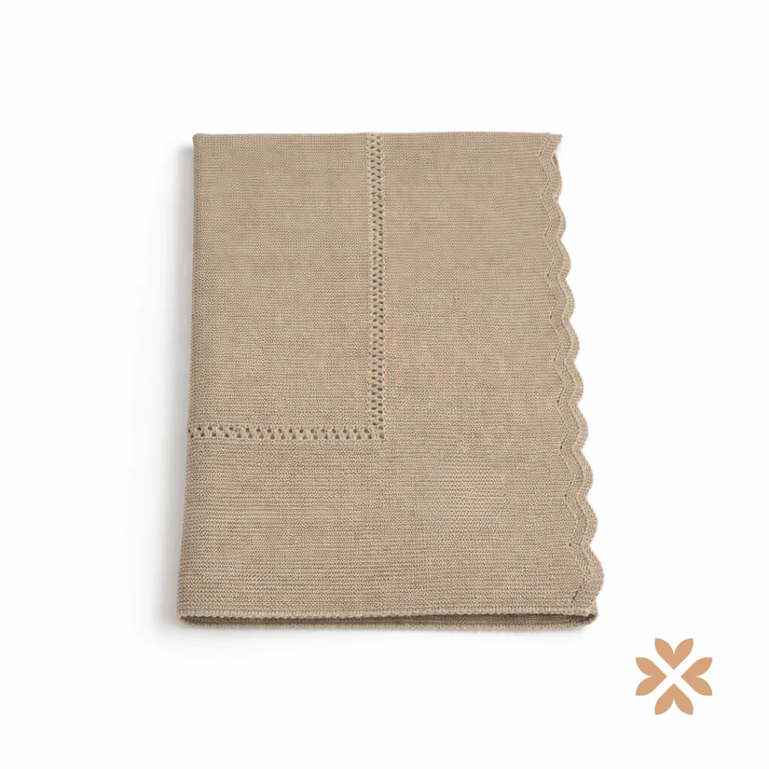 Copertina in filo di cotone con lavorazioni traforate punto a giorno e bordo smerlato. Finitura curata nei dettagli, dal design essenziale ed elegante. Ideale per completare il corredino nascita.