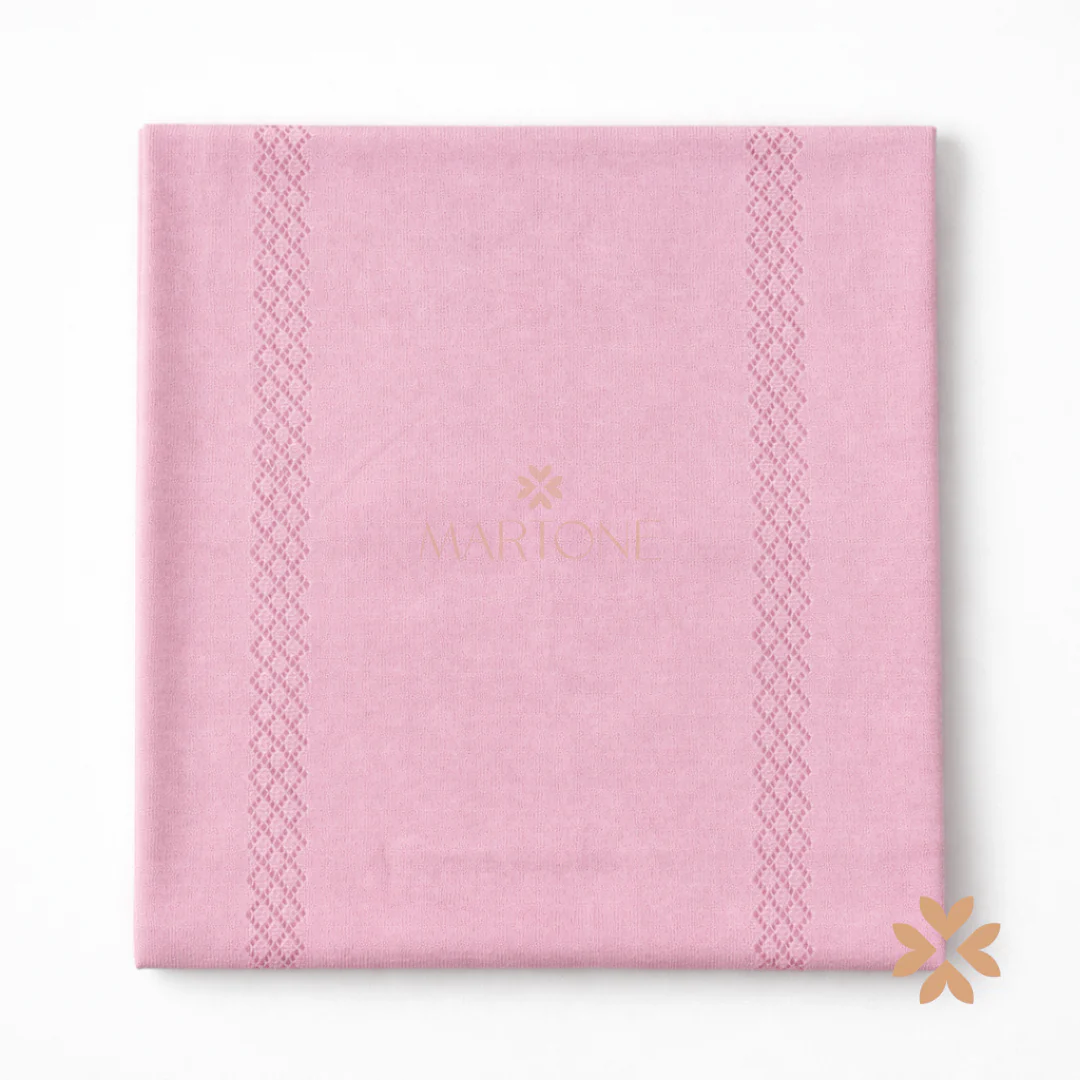 Coperta in filo di cotone lavorato a maglia, dalla struttura leggera e regolare. Design essenziale impreziosito da bande laterali traforate a motivo geometrico, che donano ritmo e raffinatezza visiva.