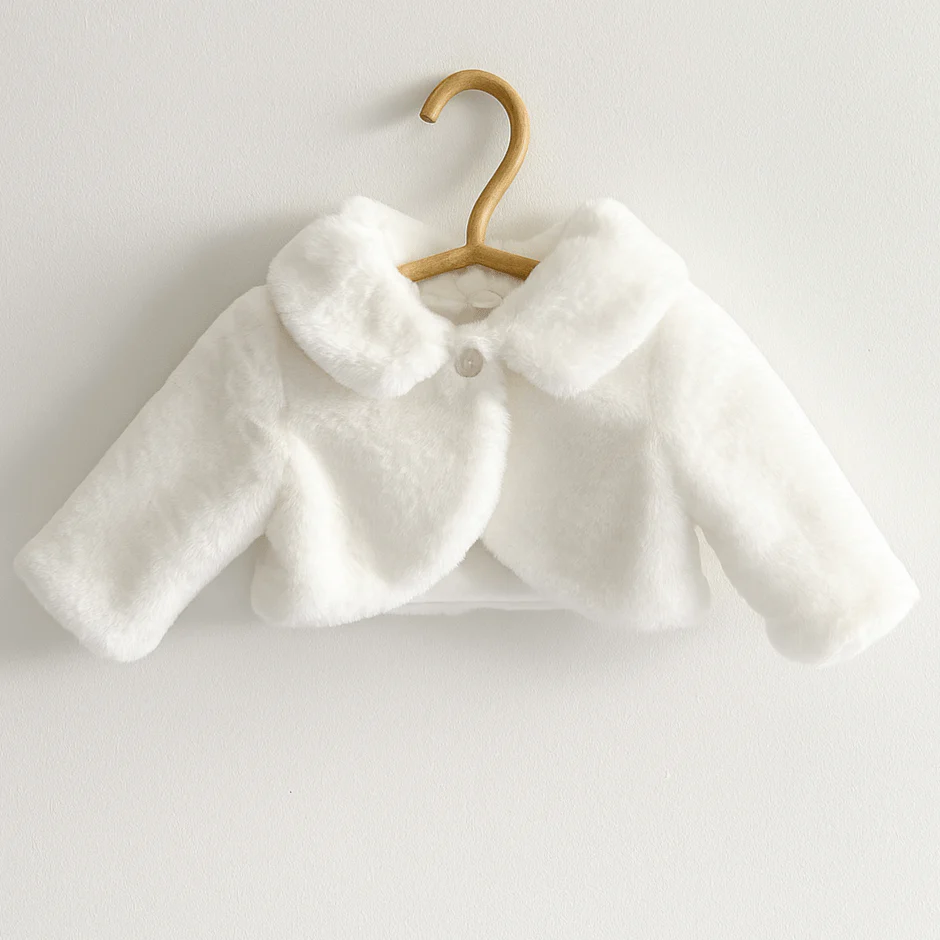 Coprispalle in morbida ecopelliccia per neonata, caldo e avvolgente. Perfetto per completare con eleganza i look delle giornate fredde.