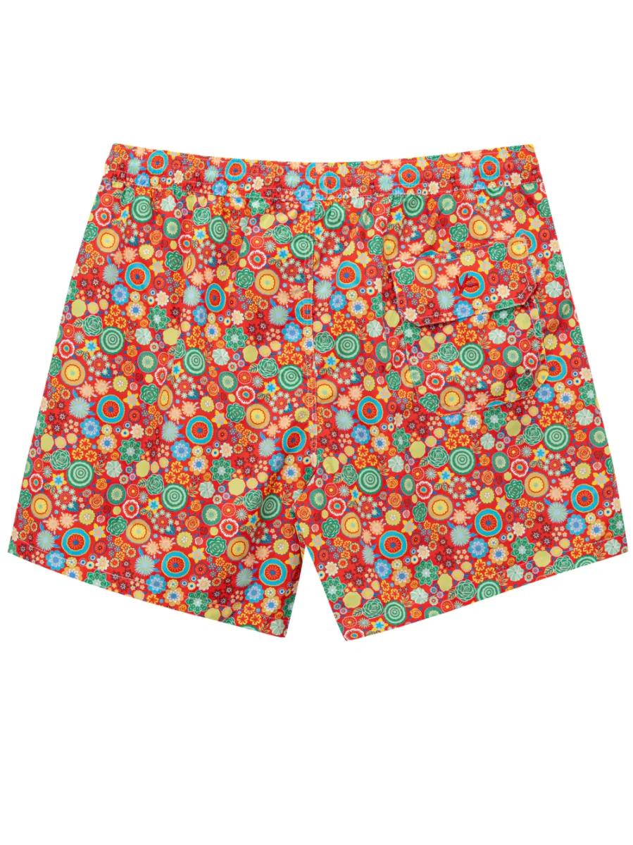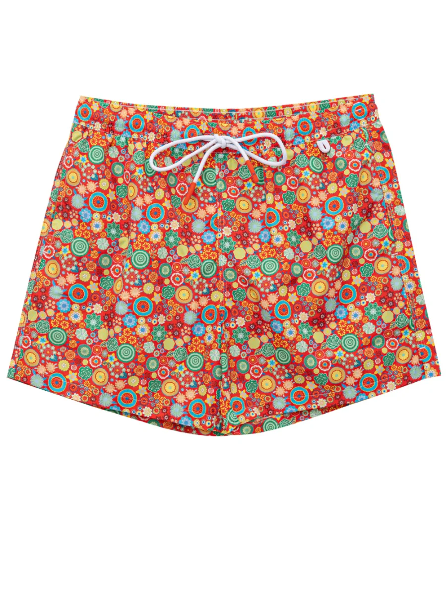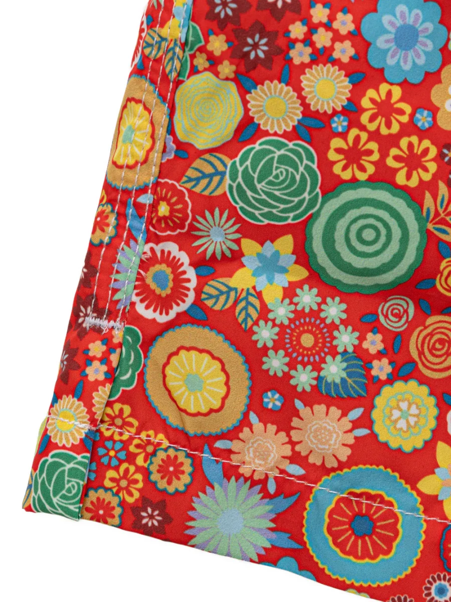 Costume Boxer con Stampa Fiori Multicolor Isaia. In rosso con stampa fiori multicolor allover, elastico in vita con coulisse regolabile, due tasche laterali a filetto, tasca posteriore con patta e velcro, rete interna. Tessuto tecnico super leggero, per un’asciugatura veloce.