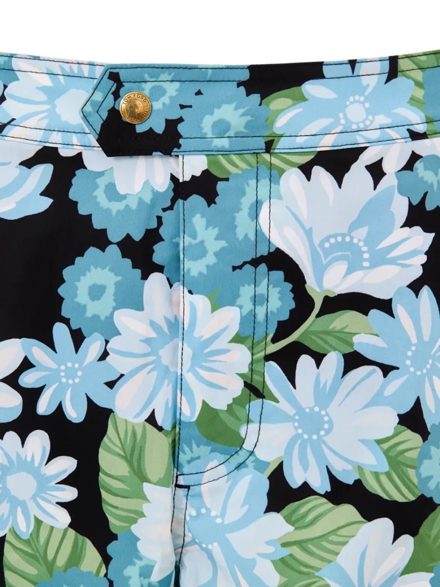 Costume Boxer con Stampa Fiori Tom Ford. In multicolor azzurro/nero/verde, allacciatura frontale con bottone automatico e zip coperta, due tasche laterali ed una posteriore chiusa con zip. Sui lati fibbie gold regolabili, slip interno e micro tag posteriore con logo.