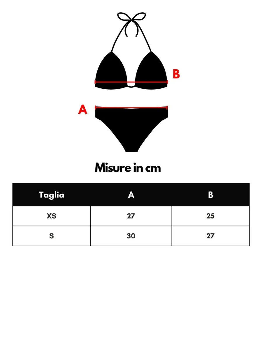 Parte superiore: Fascia top con banda elastica sul fondo, allacciatura dietro al collo con lacci.