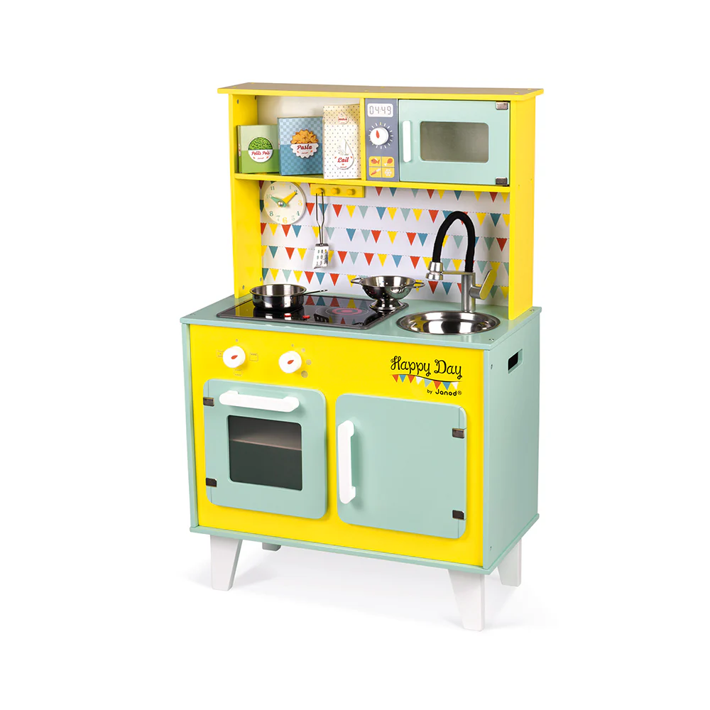 Il fornello Happy Day, completamente in legno, include un orologio, un piolo per i cucchiai, un lavello in metallo, 2 pulsanti rotanti con rumore, un piano cottura a LED che emette un suono.