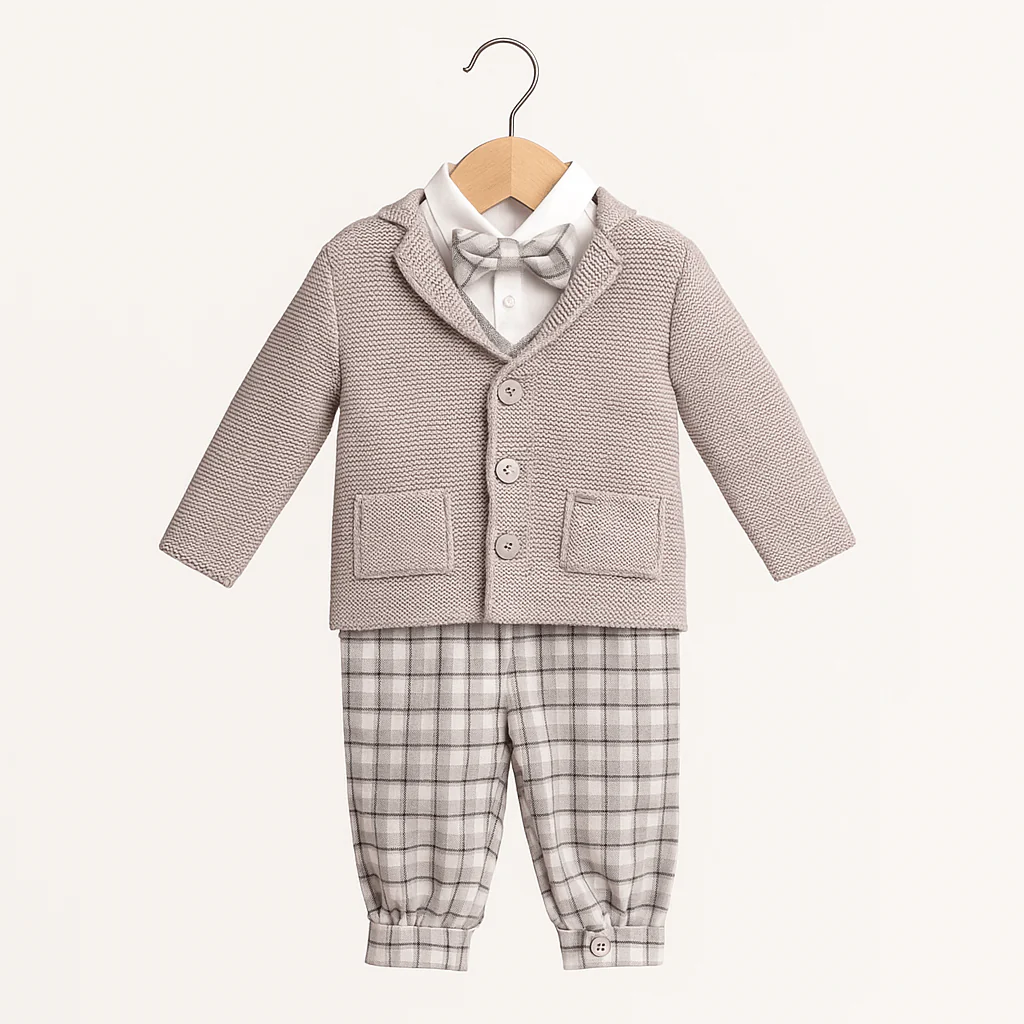 Completo elegante per neonato composto da giacca lavorata con rever e taschini applicati, camicia con colletto classico e papillon coordinato, abbinato a pantaloni a quadri con fondo elasticizzato. Una proposta sofisticata, curata nei dettagli e impeccabile nelle proporzioni, ideale per cerimonie e occasioni speciali.