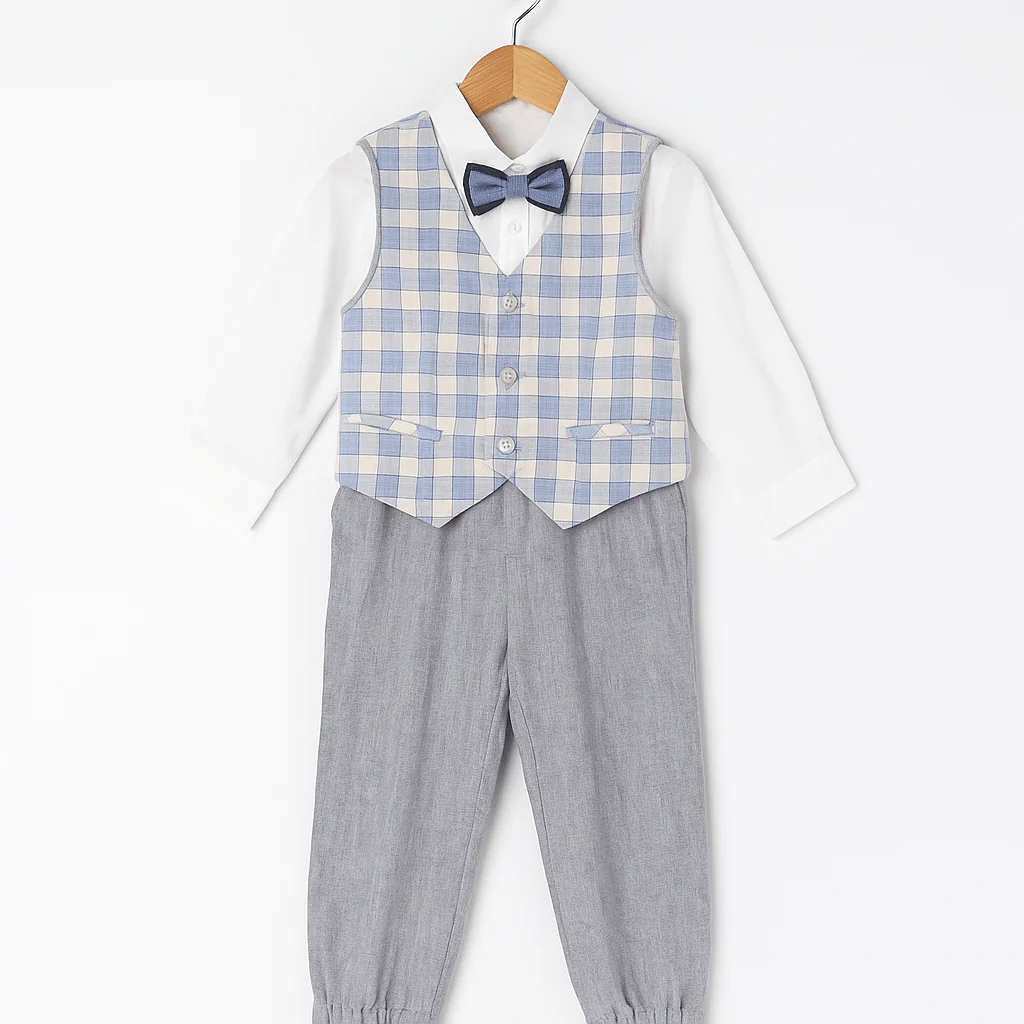 Completo elegante per neonato composto da camicia con colletto classico, gilet a quadri in tonalità pastello con bottoni e taschini decorativi, papillon coordinato e pantaloni leggeri con fondo elasticizzato. Un insieme raffinato, fresco e curato nei dettagli, perfetto per cerimonie e occasioni speciali.